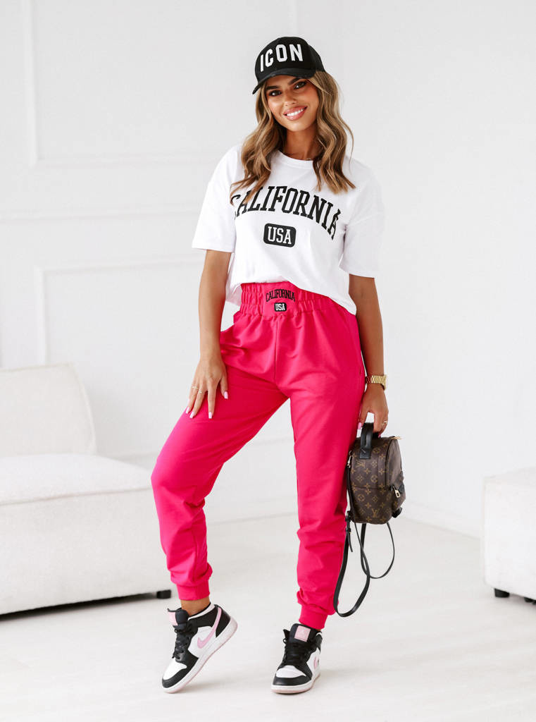 KOMPLET DRESOWY Z NAPISEM T-SHIRT+ SPODNIE- FUKSJA