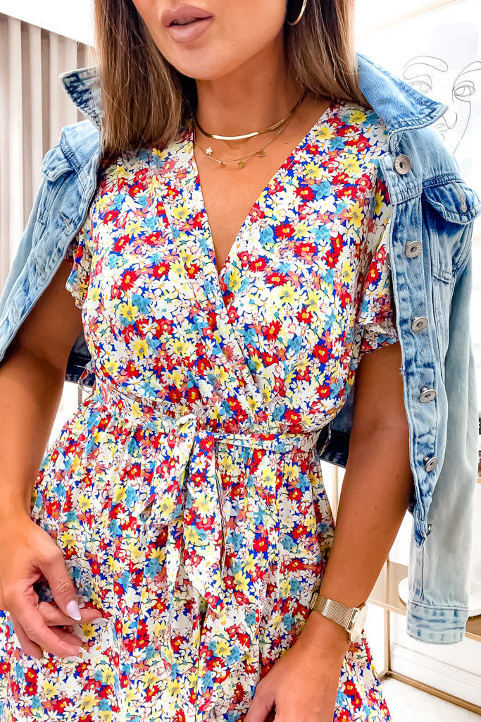 SUKIENKA NIEBIESKA MINI NA ZAKŁADKĘ Z WIĄZANIEM W PASIE I MOTYWEM KWIATOWYM