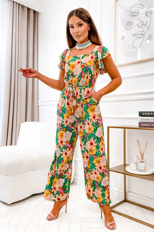 KOMBINEZON W KWIATY Z PASKIEM- ZIELONY