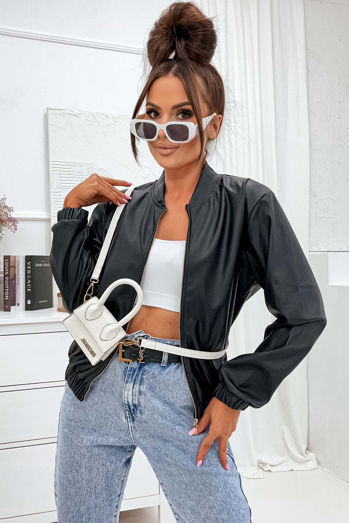 BLUZA SKAJKOWA Z ZAMKIEM I GUMĄ W PASIE- CZARNA