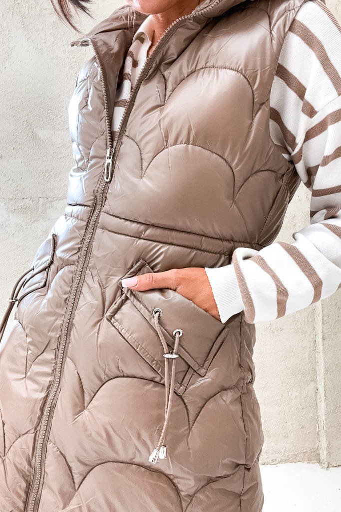 KAMIZELKA Z KAPTUREM I OZDOBNYMI KIESZENIAMI- BRĄZOWA