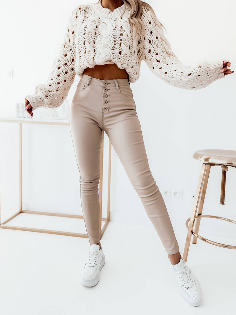 WOSKOWANE SPODNIE Z WYSOKIM STANEM I GUZIKAMI- BEŻOWY