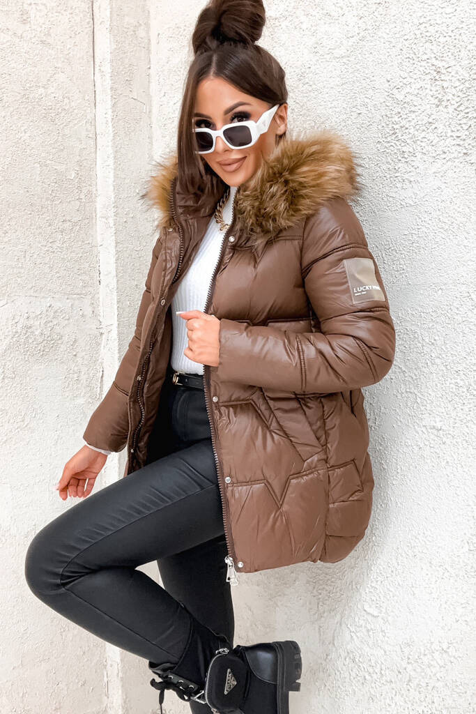CIEMNO BRĄZOWA KURTKA PIKOWANA Z NASZYWKĄ NA RĘKAWIE