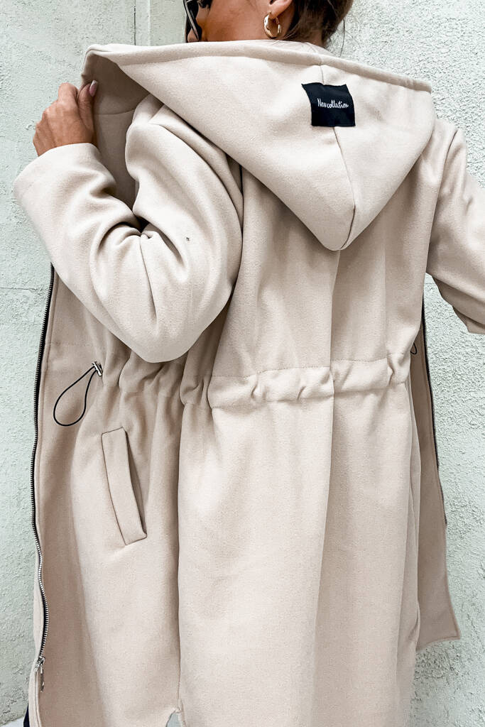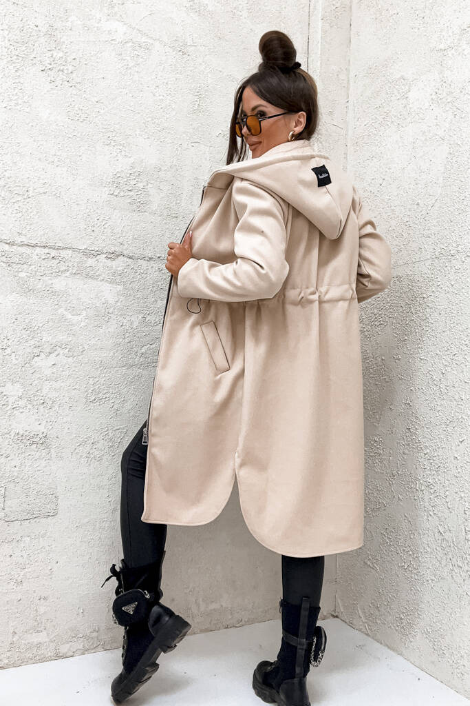PŁASZCZ POLAROWY Z KAPTUREM I ŚCIAGACZEM W PASIE- BEŻOWY