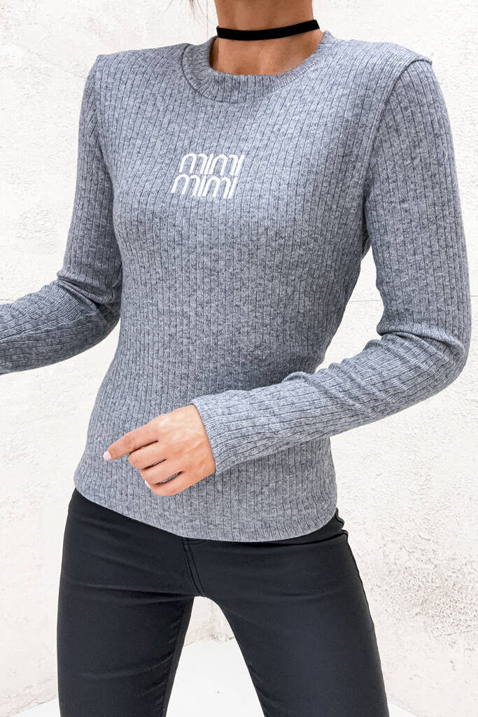 PRĄŻKOWANA BLUZKA Z WYSZYWANYM NAPISEM- SZARA
