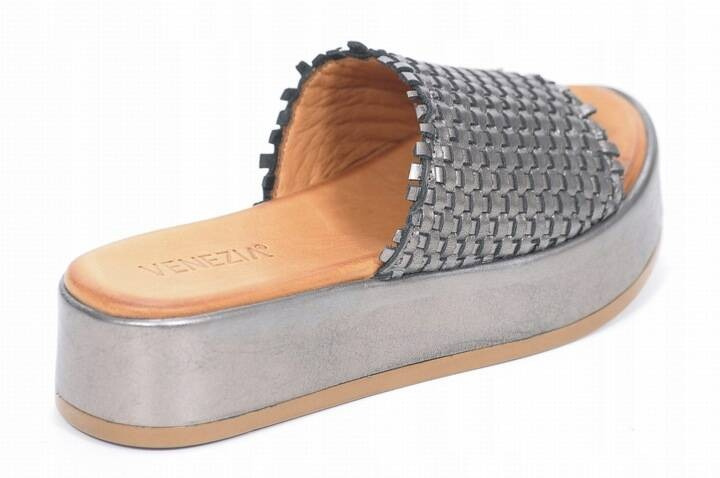 Srebrne klapki wykonane ze skóry cielęcej. Uwagę zwraca tłoczona aplikacja na cholewce. Niewysoki koturn powleczony połyskującą skórą delikatnie uniesie sylwetkę. Skórzana wkładka podbita miękką pianką świetnie sprawdzi się podczas codziennego użytkowania. Modne i wygodne będą doskonałym uzupełnieniem letnich stylizacji.