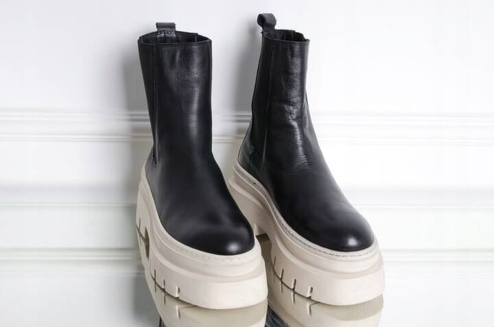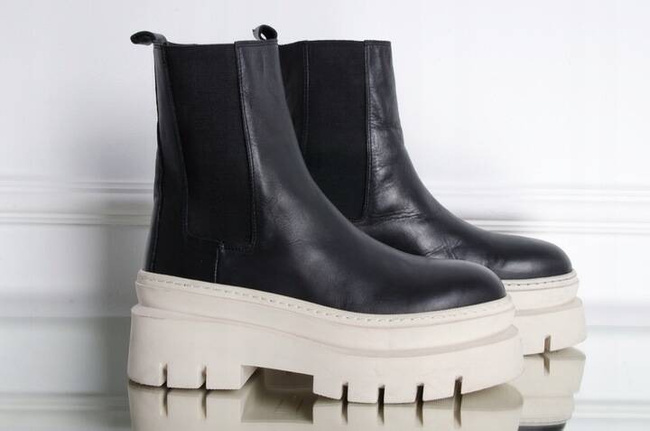 Czarne botki damskie wykonane ze skóry cielęcej o gładkim licu. Model osadzony na nowoczesnej platformie świetnie wpisuje się w najmodniejsze trendy sezonu.