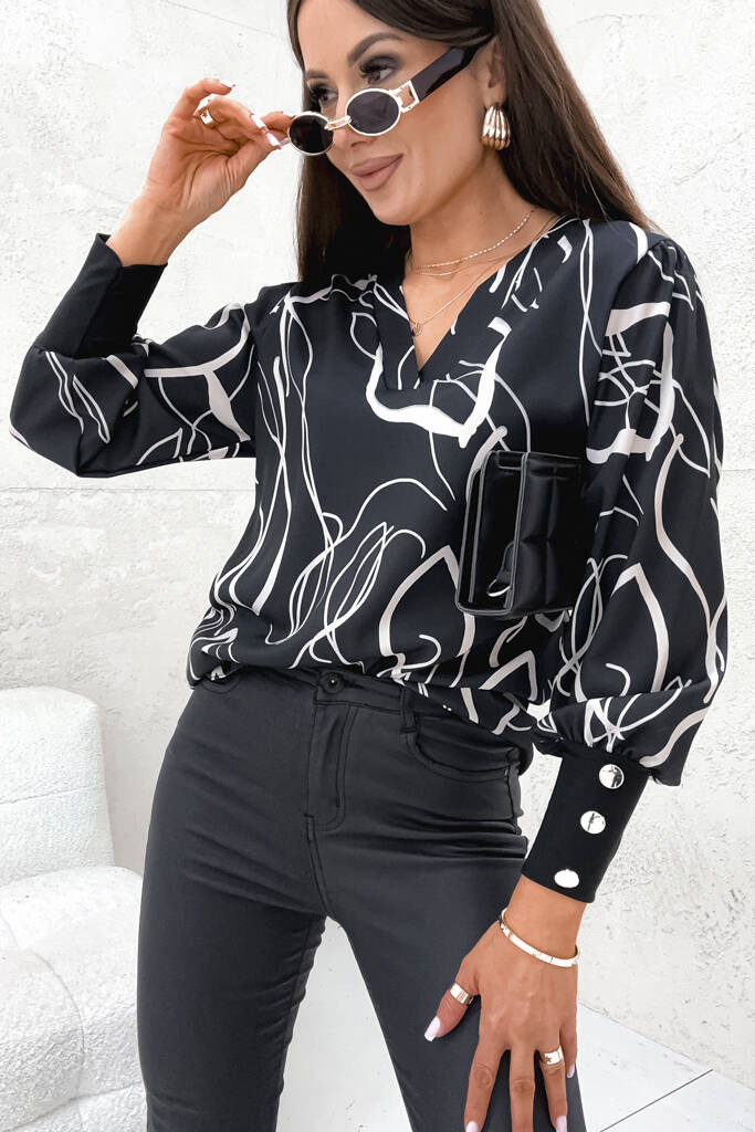 BLUZKA WE WZORY Z OZDOBNYMI GUZIKAMI PRZY RĘKAWACH- CZARNA