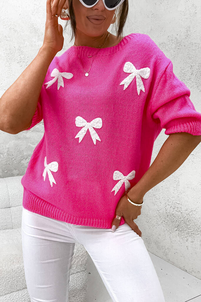 SWETER Z KRÓTKIM RĘKAWEM W KOKARDY- CIEMNY RÓŻ