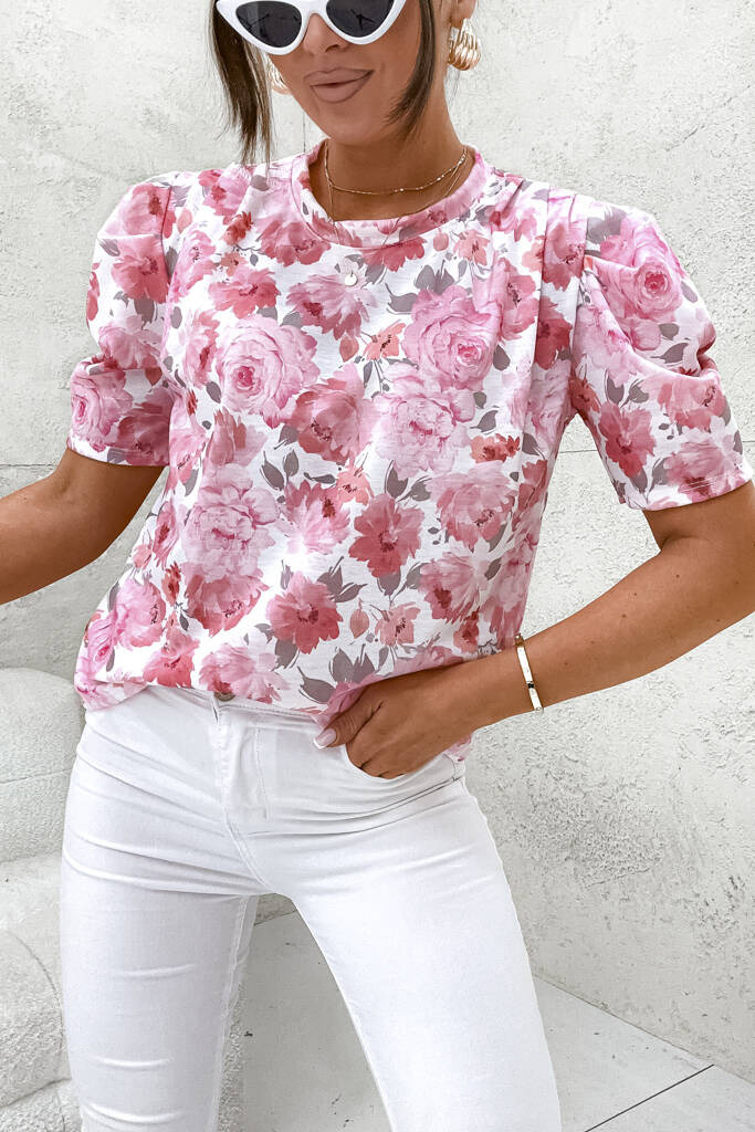 BLUZKA ONE SIZE W KWIATY I RĘKAWY BUFKI- RÓŻOWA