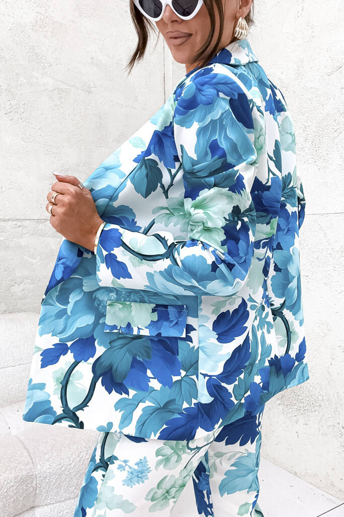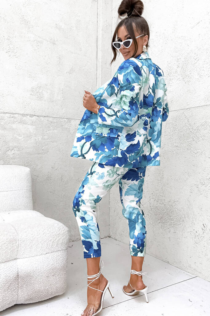 ELEGANCKI KOMPLET W KWIATY MARYNARKA+ SPODNIE- TURKUSOWY