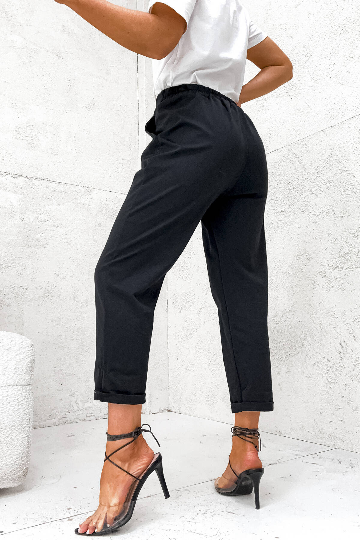 SPODNIE MATERIAŁOWE Z ŁAŃCUSZKIEM PRZY KIESZENI- CZARNE