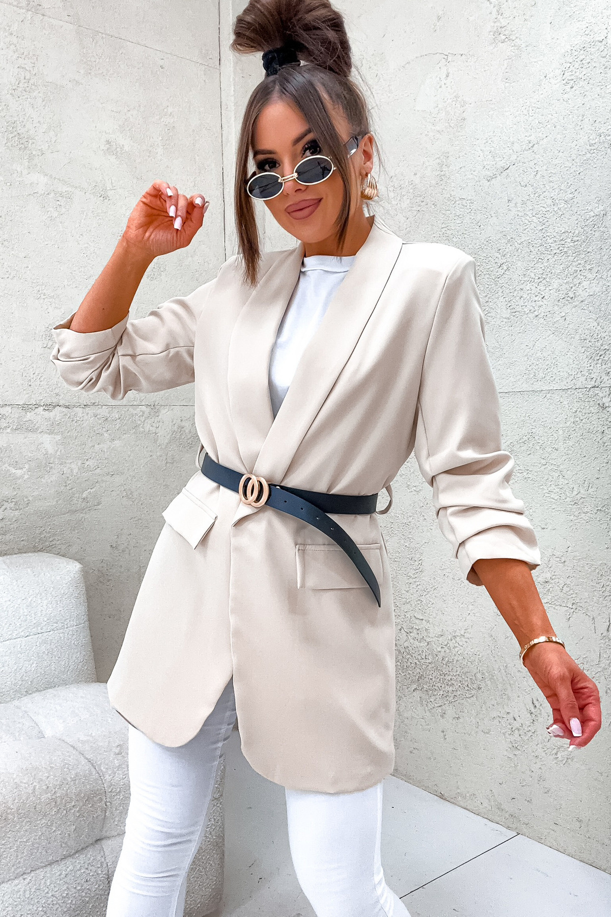 DŁUŻSZA MARYNARKA Z PASKIEM I MARSZCZONYM RĘKAWEM- BEŻOWA