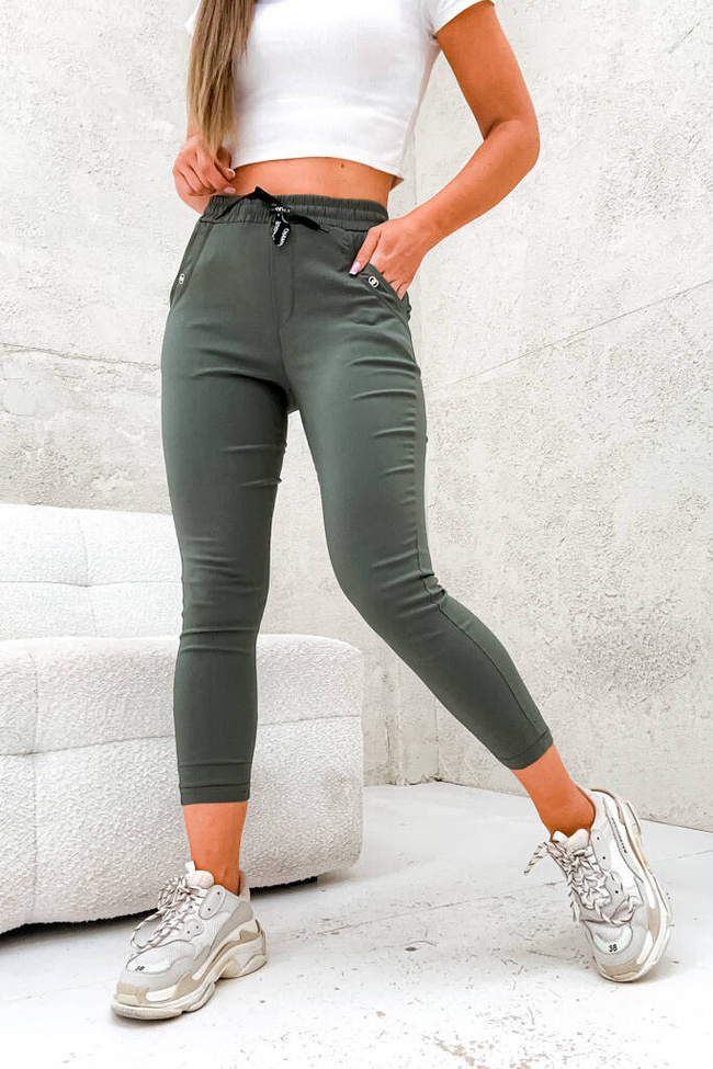 SPODNIE ZE ŚCIAGACZEM W PASIE I OZDOBĄ NA KIESZENI- ZIELONE
