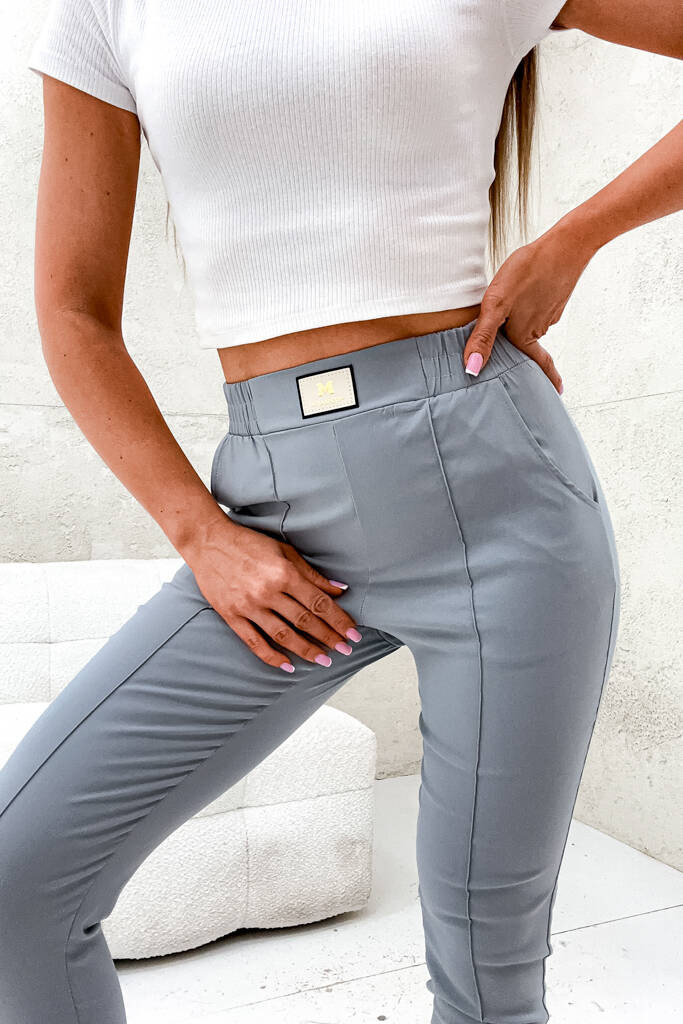 SPODNIE Z PRZECZYCIAMI I NASZYWKĄ NA PASIE-SZARE