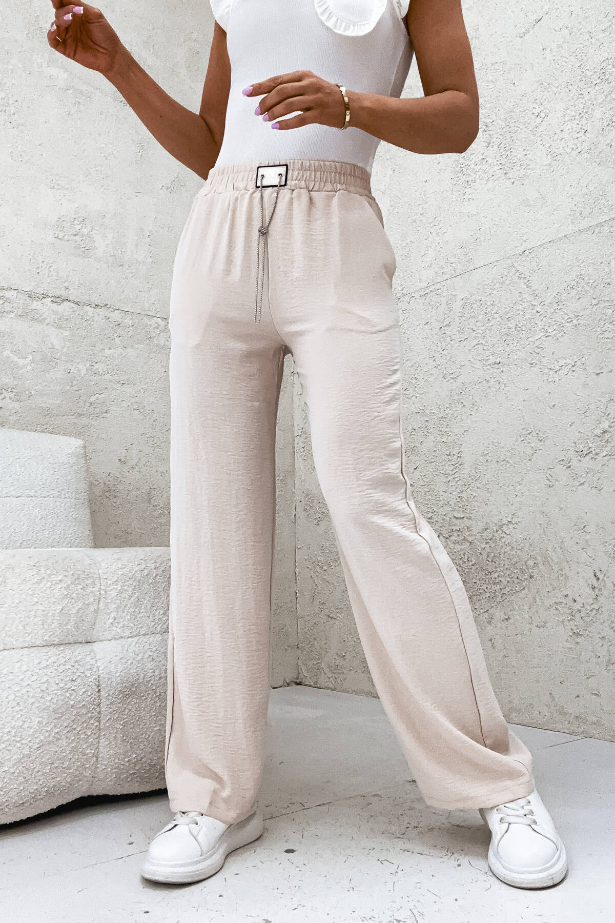 SPODNIE MATERIAŁOWE Z SZEROKĄ NOGAWKĄ I ŁAŃCUSZKIEM W PASIE- JASNO BEŻOWE