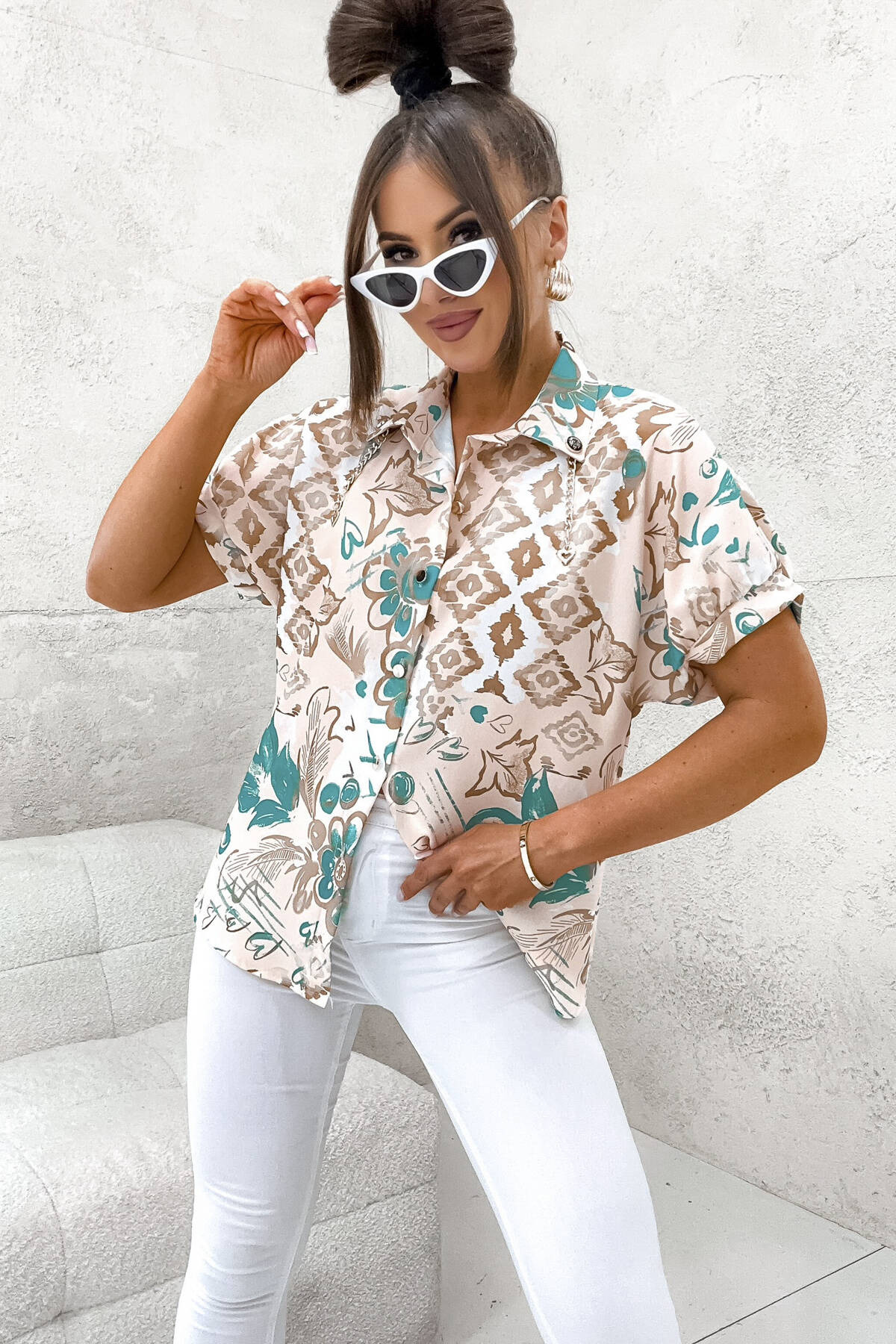 WZORZYSTA BLUZKA ZAPINANA NA GUZIKI Z ŁAŃCUSZKAMI-BEŻOWA