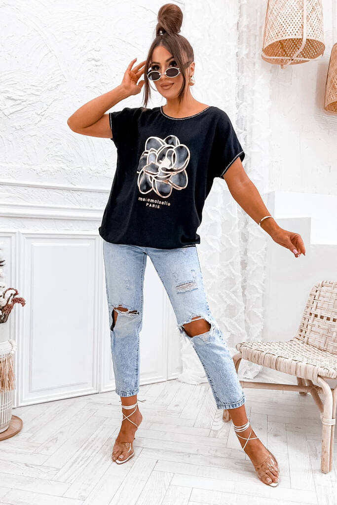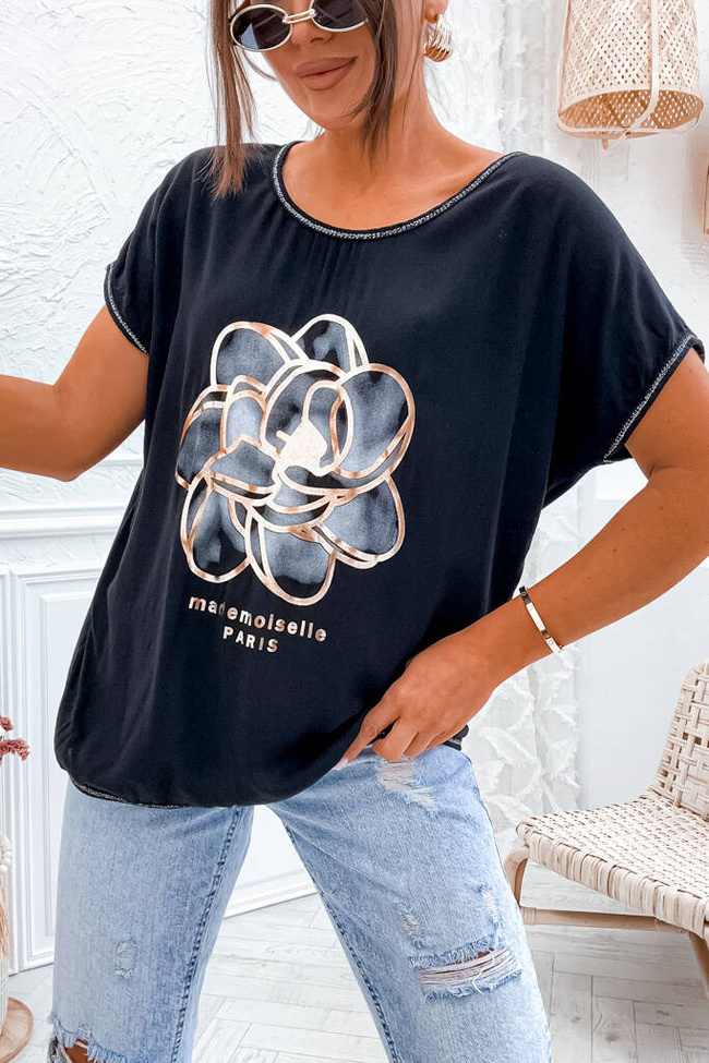 BLUZKA ONE SIZE ZE ZŁOTYM KWIATEM I OZDOBNA LAMÓWKĄ- CZARNA