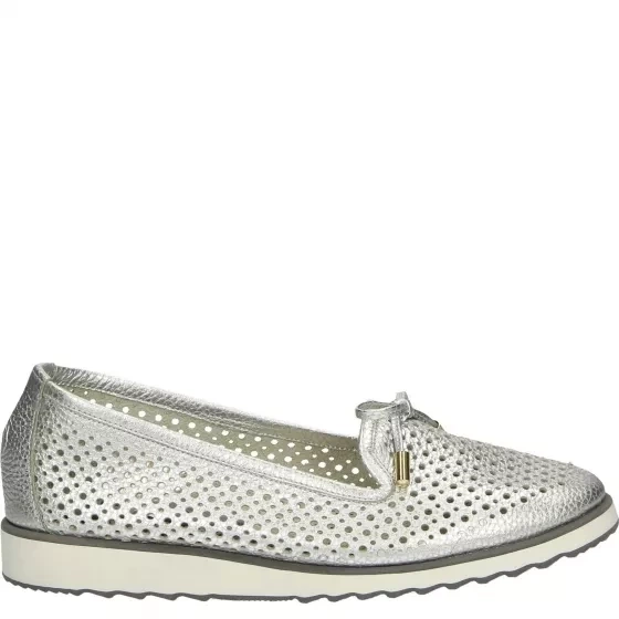 Srebrne mokasyny wykonane ze skóry naturalnej. Fason z zaokrąglonym noskiem i lekko usztywnianym zapiętkiem. Komfort podczas noszenia zapewni bardzo miękka, skórzana wyściółka z elementami perforacji. Dodatek stanowi efektowny, ozdobny element na nosku.