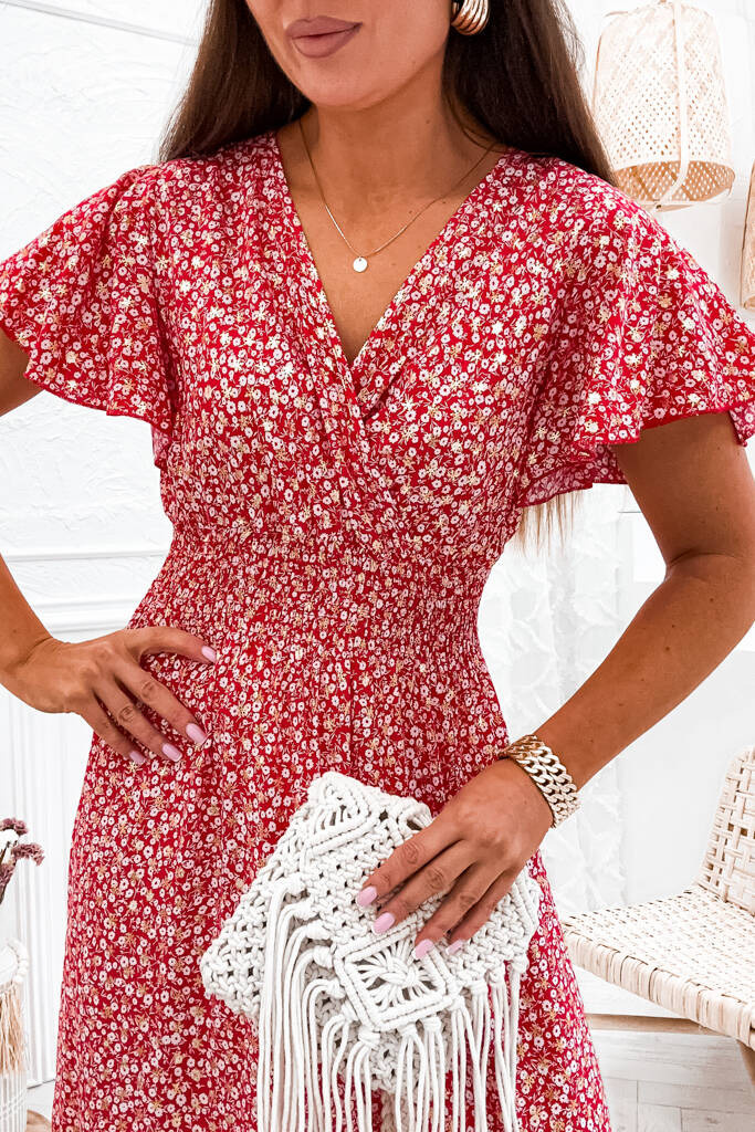SUKIENKA MAXI W KWIATY I ZŁOTE GWIAZDKI DEKOLT KOPERTOWY-CZERWONA
