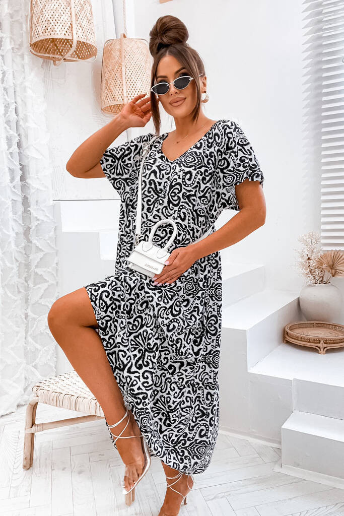 WZORZYSTA SUKIENKA MAXI DEKOLT W SEREK- CZARNA