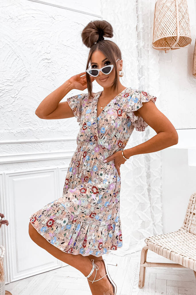 SUKIENKA MINI W KWIATY DEKOLT KOPERTOWY I GUMKA W PASIE- BEŻOWA