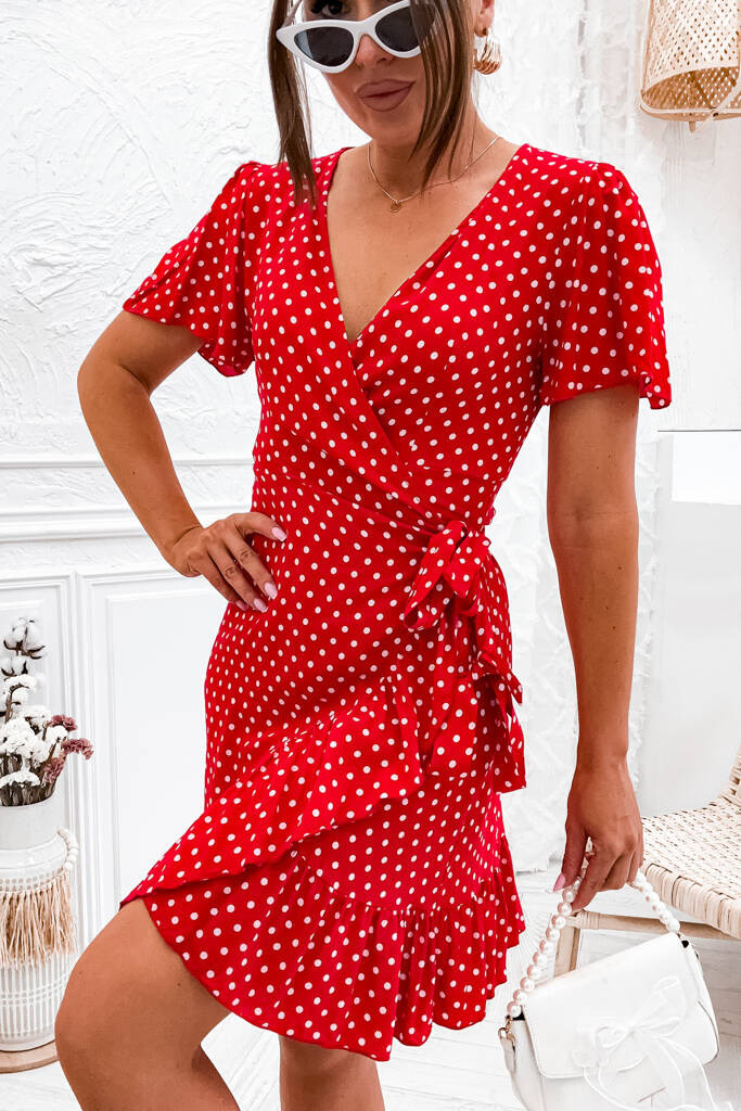SUKIENKA KOPERTOWA W KROPKI Z PASKIEM- CZERWONA
