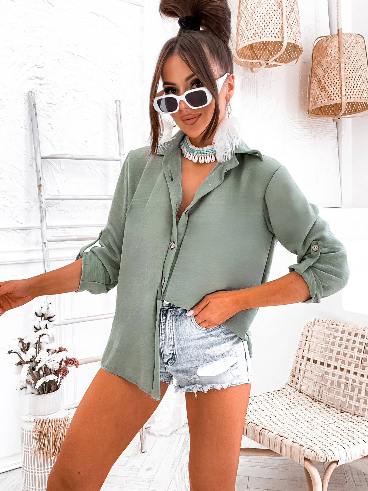 LNIANA KOSZULA Z PODWIJANYM RĘKAWEM- ZIELONA