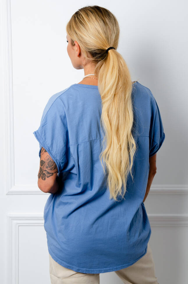BLUZKA Z KWIATEM I WIĄZANIEM NA DOLE- NIEBIESKA