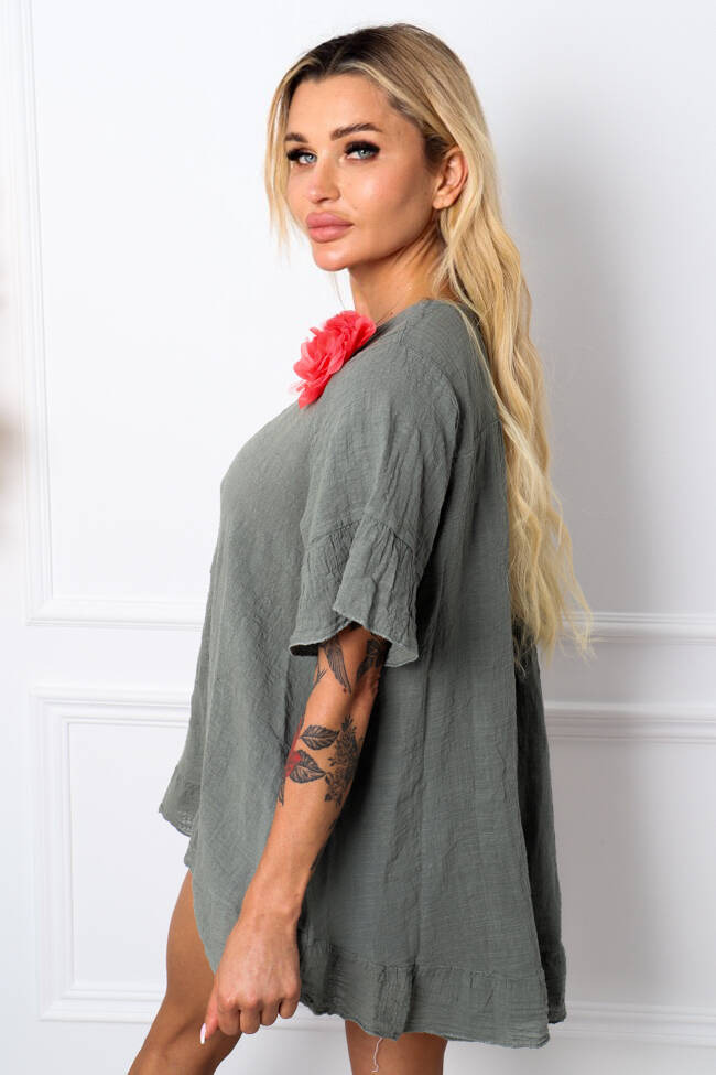 ASYMETRYCZNA BLUZKA Z LNU+ OZDOBNY KWIAT- KHAKI