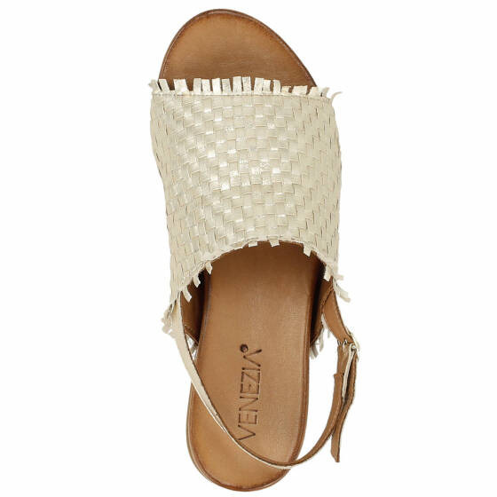 Sandały wykonane z metalizowanej skóry cielęcej w kolorze złotym. Luźna cholewka z efektowną plecionką świetnie wpisuje się w klimat boho. Skórzany pasek na pięcie dzięki regulacji można z łatwością dopasować do indywidualnych wymiarów. Wyściółka ze skóry licowej posiada doskonałą wchłanialność wilgoci, do tego jest komfortowa i miękka w dotyku. Gumowa podeszwa amortyzuje każdy krok oraz dopełnia estetyczny wygląd. Metaliczne sandałki dodadzą blasku każdej, letniej stylizacji.