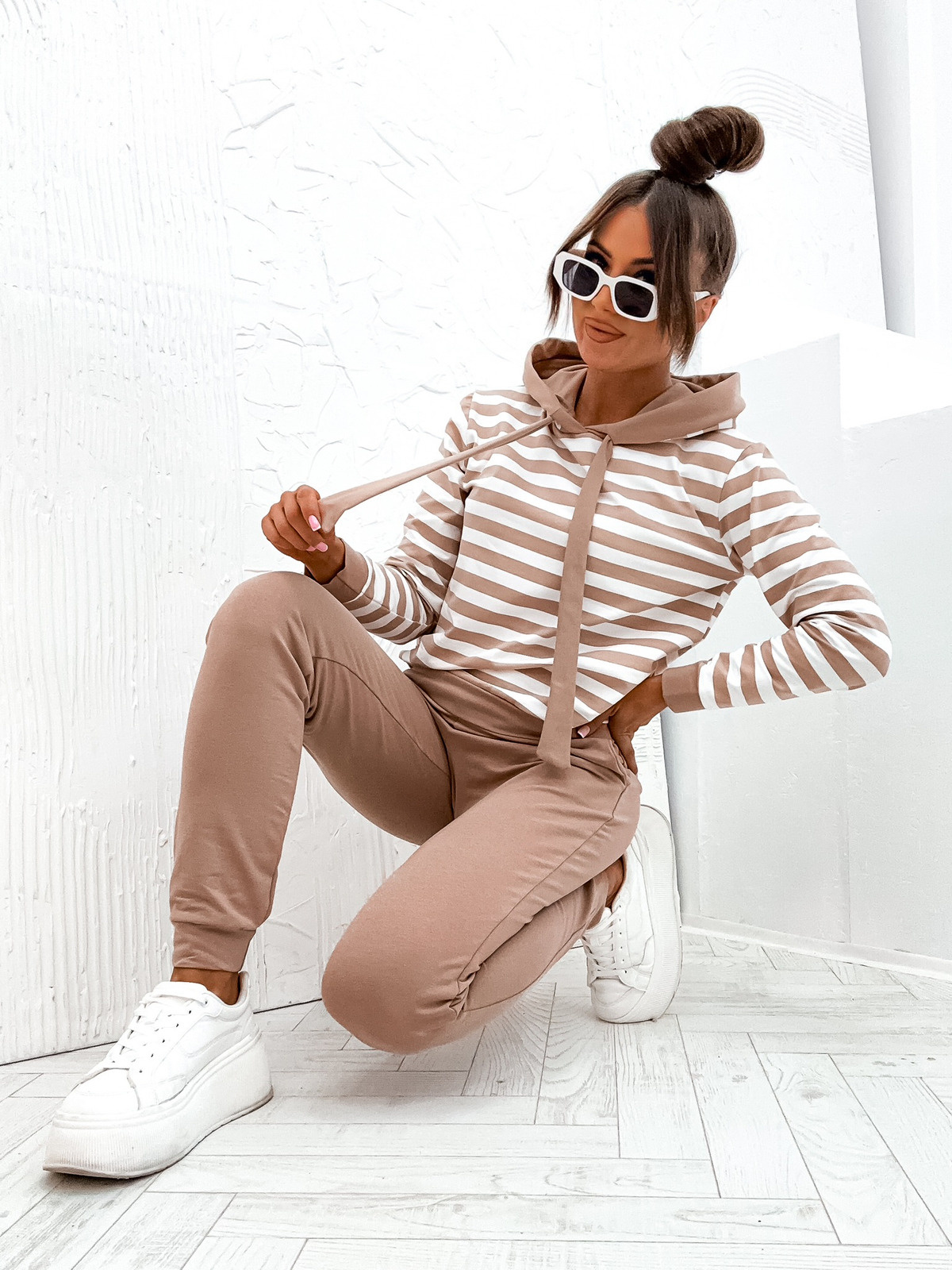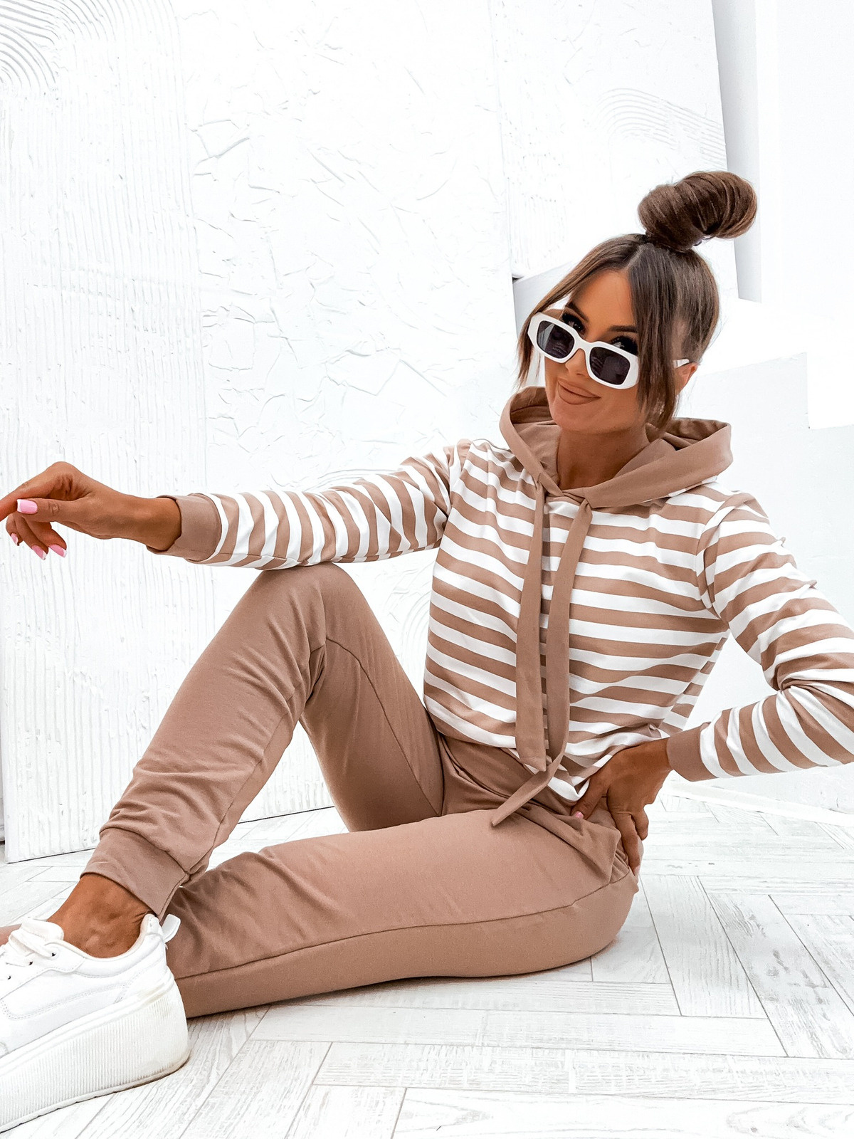 KOMPLET DRESOWY BLUZA W PASKI+ SPODNIE- BEŻOWY