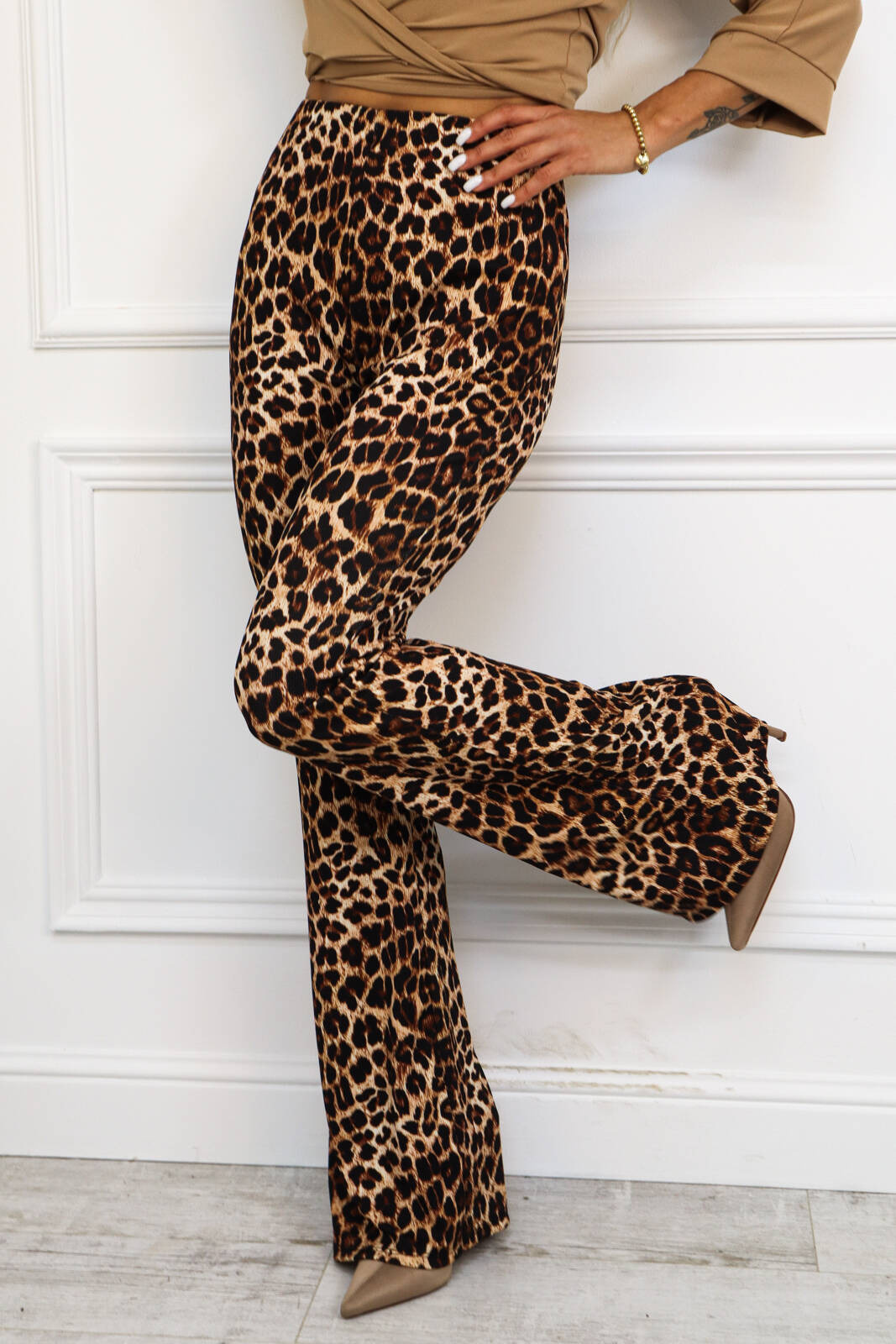 Dżersejowe legginsy. Wysoki stan, kryta elastyczna talia, rozszerzane nogawki. Panterkowy wzór.