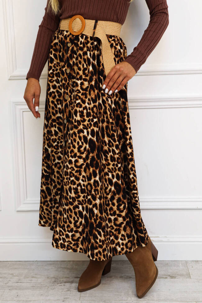 SPÓDNICA MIDI Z GUZIKAMI W PANTERKĘ+ PASEK- CIEMNY BRĄZ