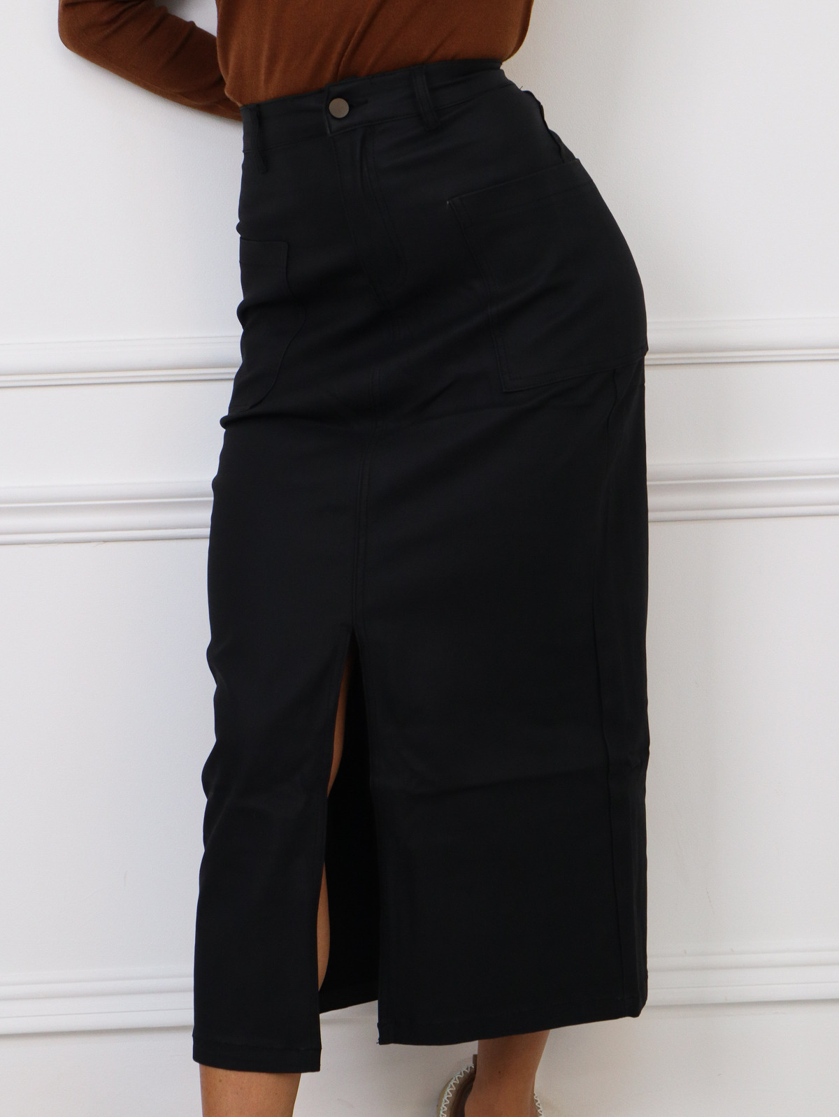 SPÓDNICA Z IMITACJI SKÓRY Z KIESZENIAMI Z PRZODU I ROZPORKIEM-CZARNA