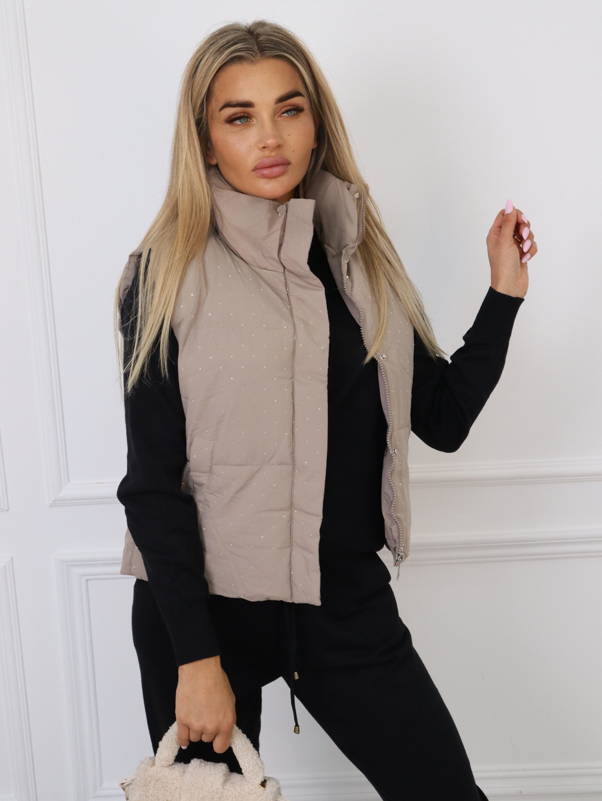 Pikowana kamizelka wykonana ze śliskiego, matowanego materiału. Kamizelka na stójce, dół zakończony ścigaczem, Zapinana na zamek, przepięknie wysadzana srebrnymi cyrkoniami