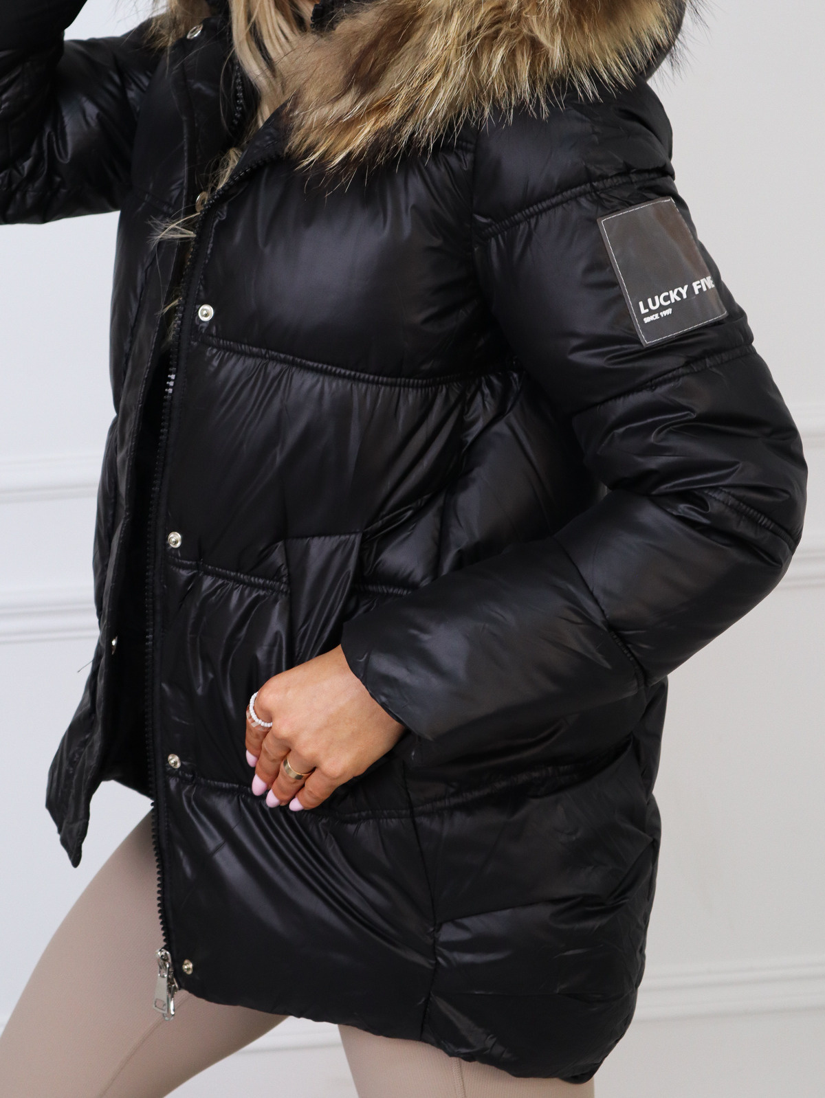 KURTKA ASYMETRYCZNA Z NASZYWKĄ NA RĘKAWIE I FUTERKIEM- CZARNA