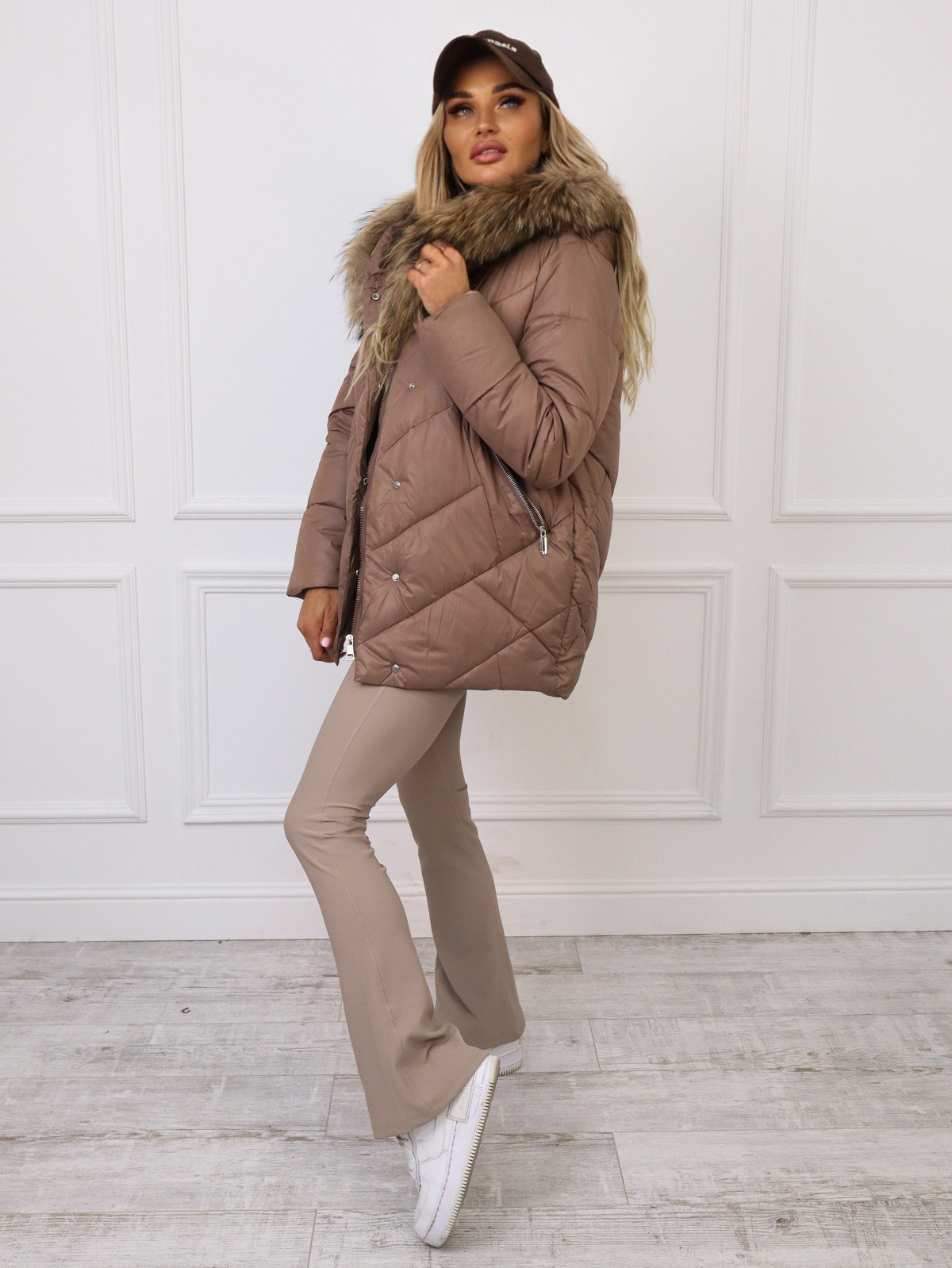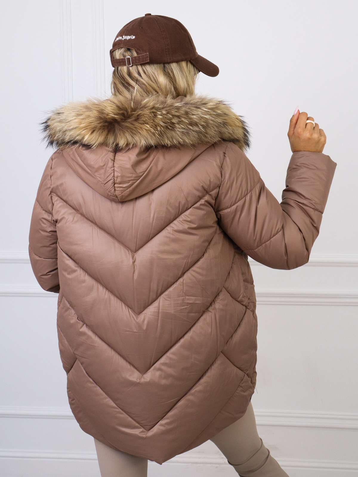 KURTKA ASYMETRYCZNA Z FUTERKIEM I KIESZENIAMI NA ZAMKI-BRĄZOWA