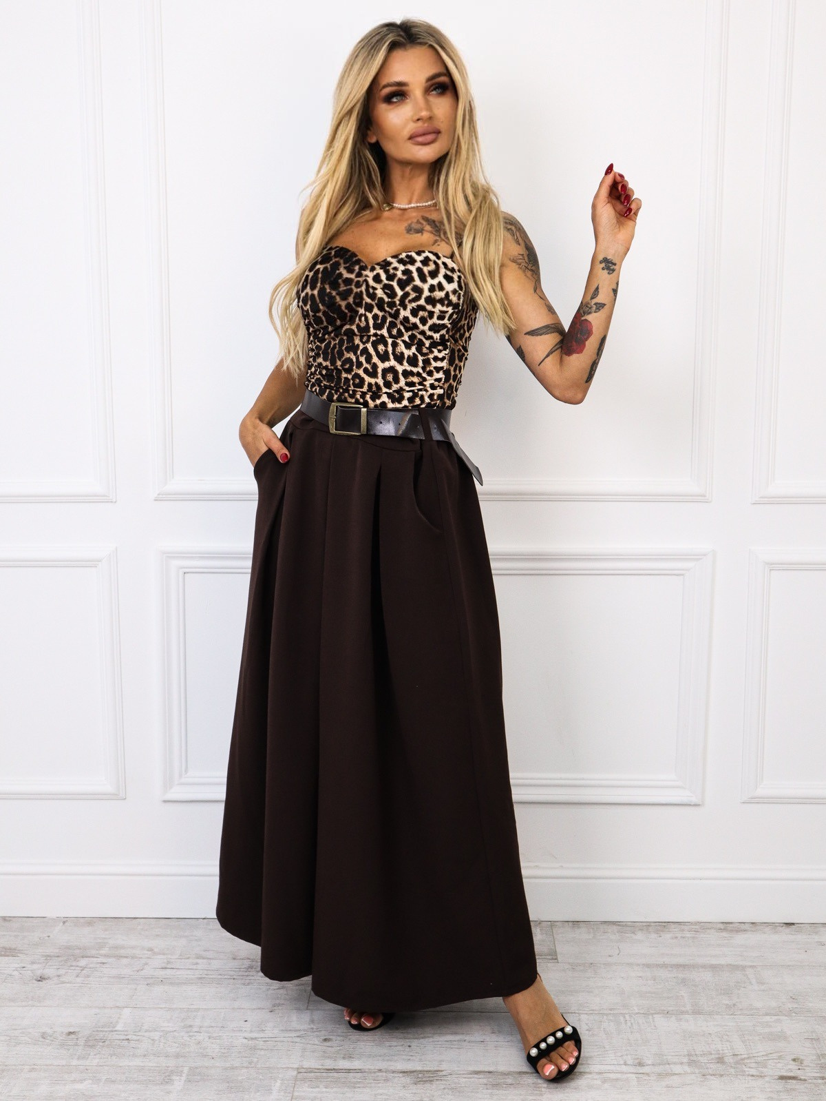 MATERIAŁOWA SPÓDNICA MIDI Z KIESZENIAMI+ PASEK- CIEMNO BRĄZOWA