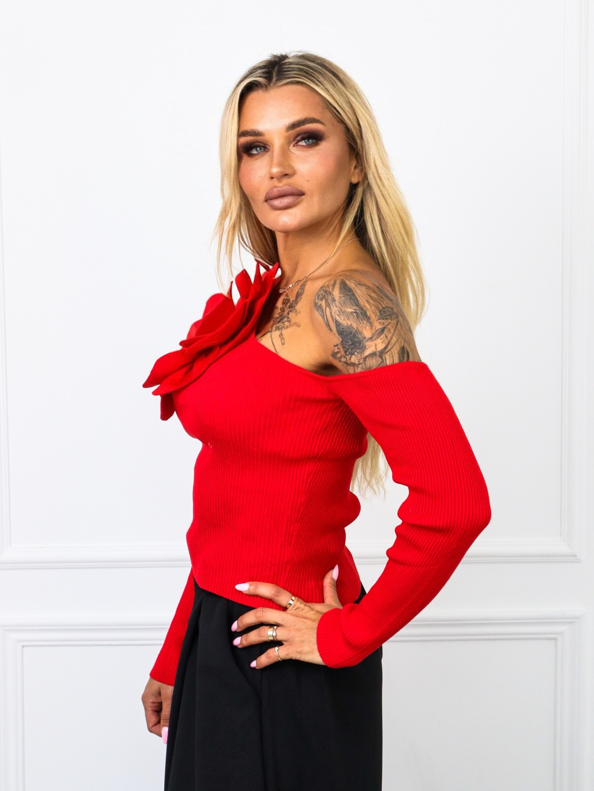 BLUZKA PRĄŻKOWANA NA JEDNO RAMIE Z DUŻYM KWIATEM- CZERWONA