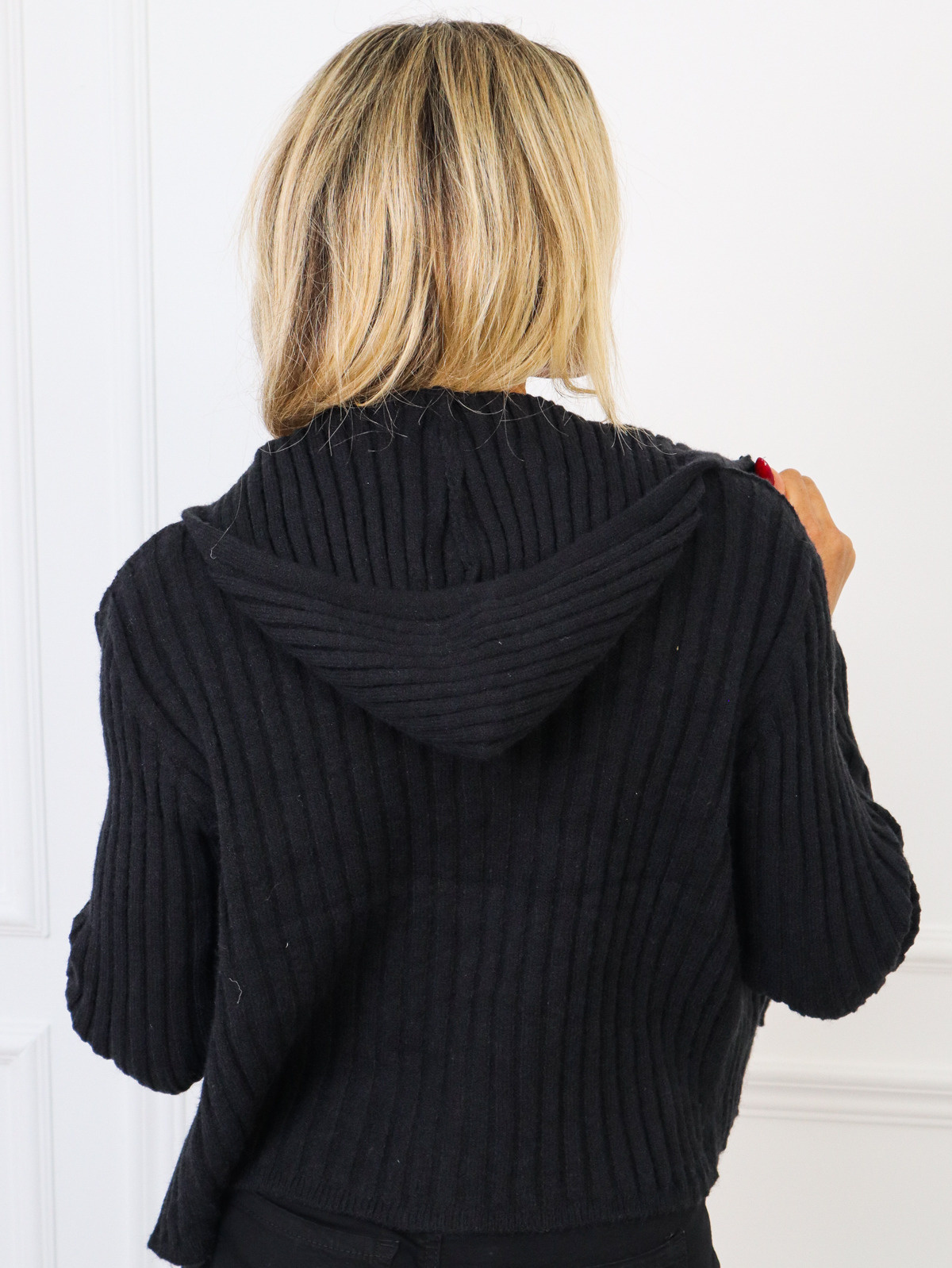 DZIANINOWA BLUZA W PRĄŻEK Z KAPUREM NA SUWAK- CZARNA