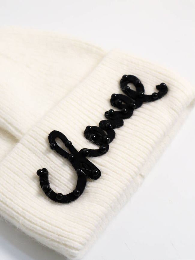 CZAPKA Z DOMIESZKĄ WEŁNY ORAZ NAPISEM Z KORALIKAMI-BIAŁA