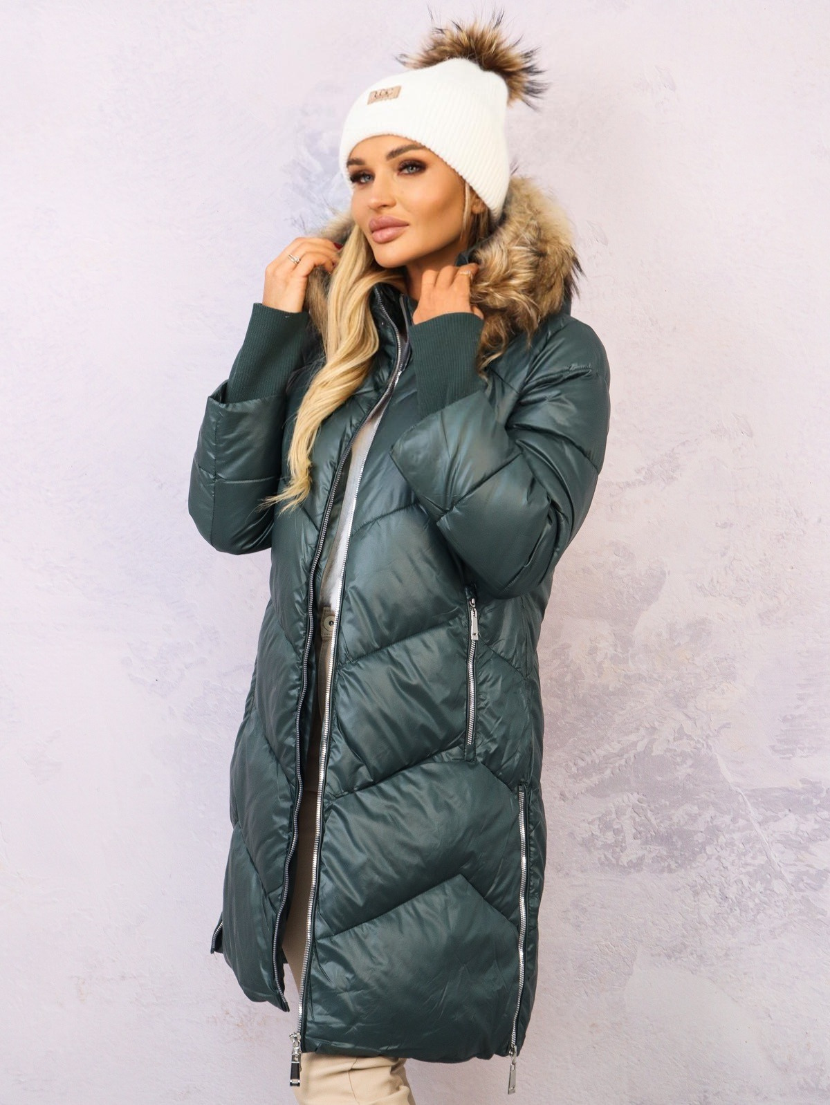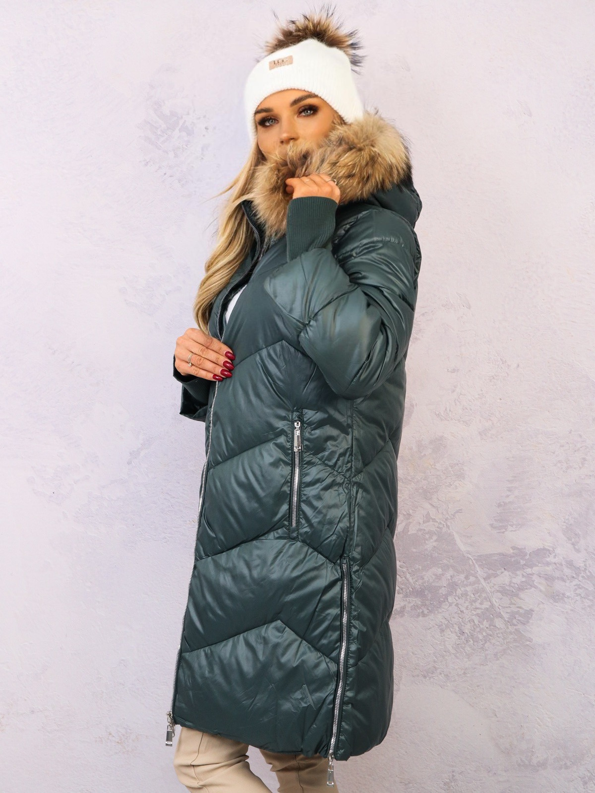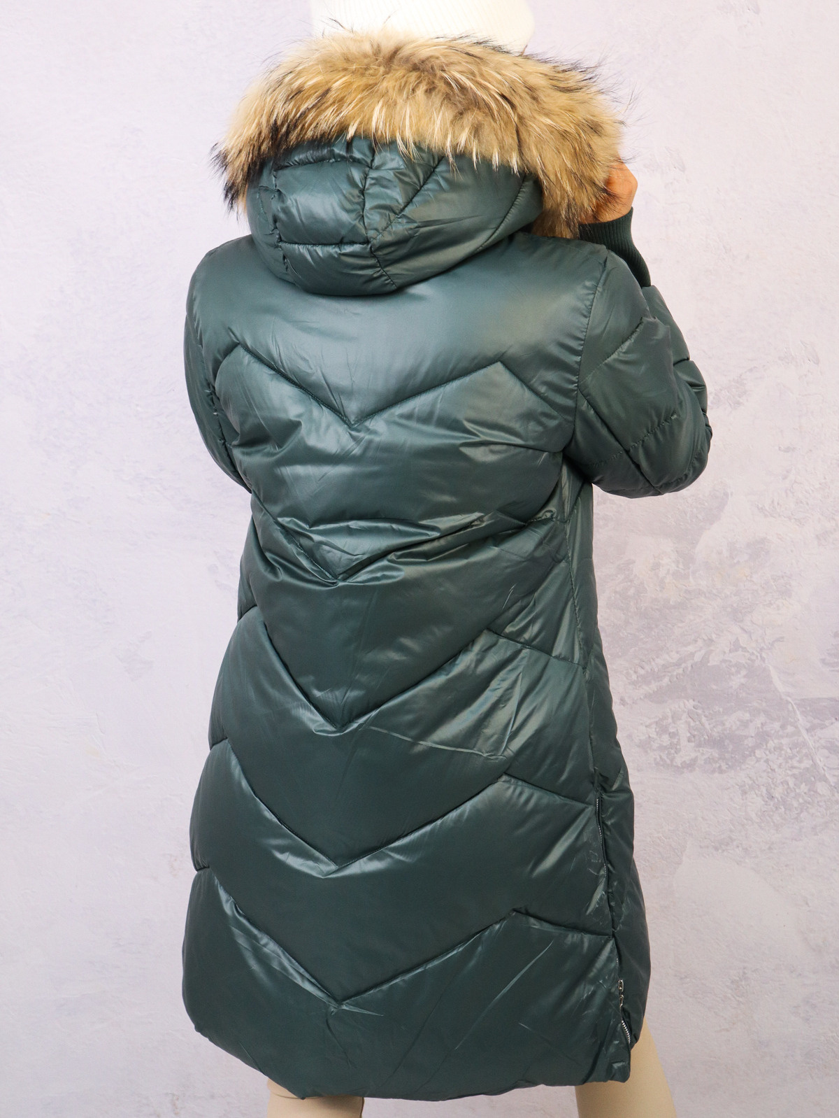 Długa, pikowana kurtka z kapturem. Kieszenie na zamek, rozporki po bokach. Odpinane futerko.