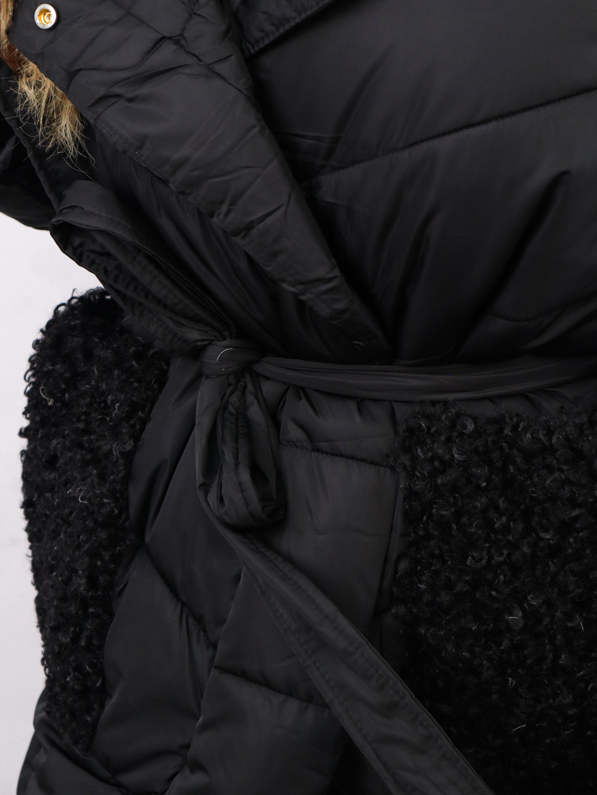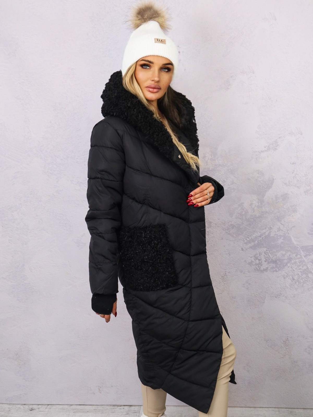 DŁUGA KURTKA Z FUTRZANYM KAPTUREM I KIESZENIAMI- CZARNA