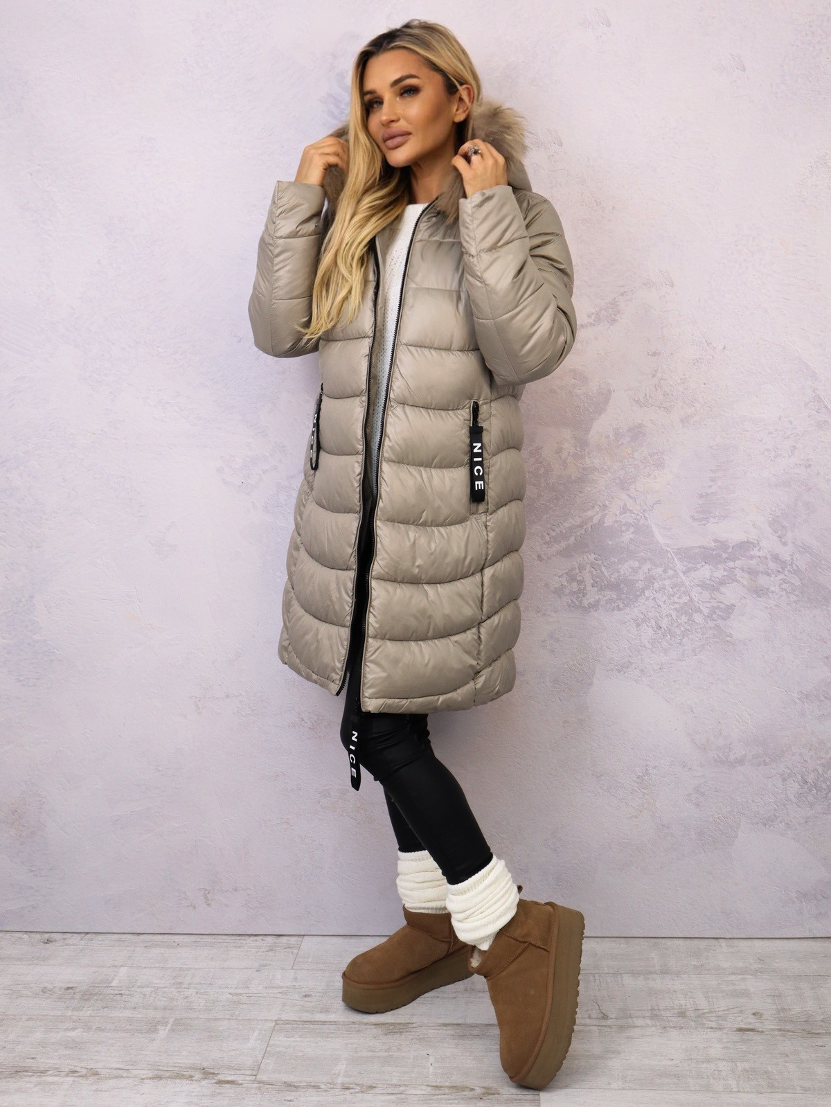 Długa, pikowana kurtka z kapturem. Ozdobne taśmy z napisem przy zamkach. Ściągacze przy rękawach, odpinane futro przy kapturze.