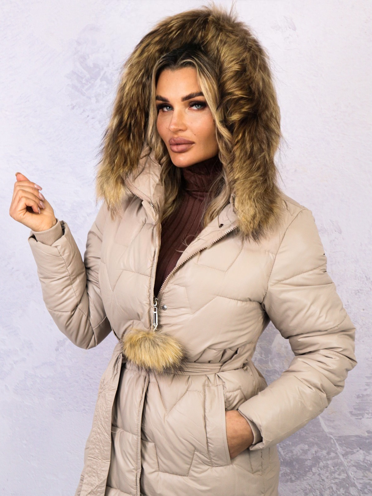 DŁUGA PIKOWANA KURTKA Z FUTERKIEM- BEŻOWA