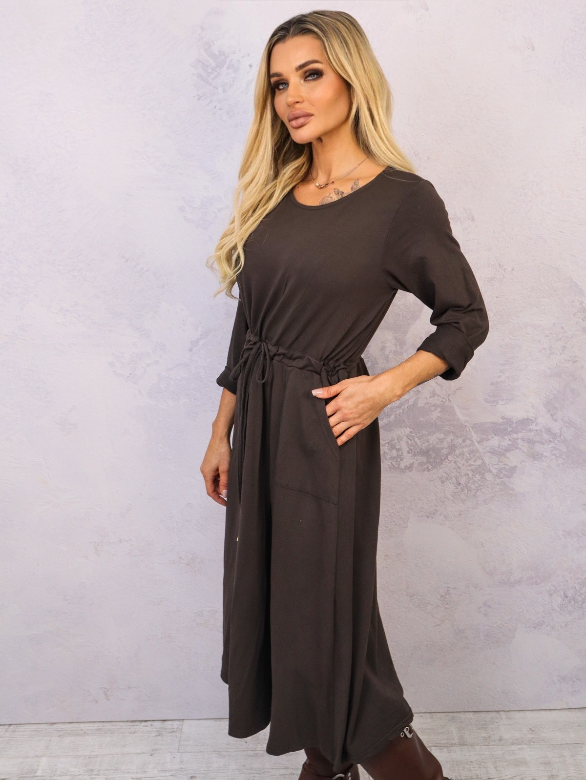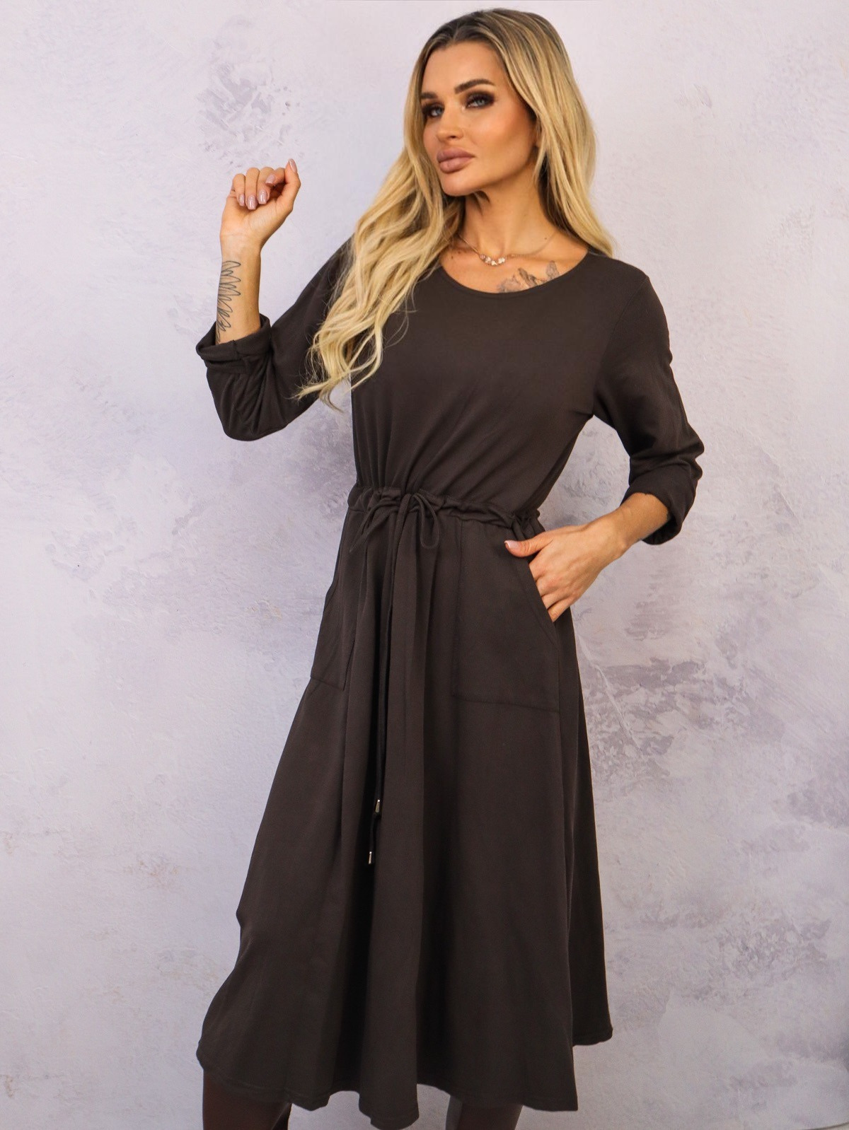 SUKIENKA MIDI WIĄZANA W PASIE- CIEMNO BRĄZOWA