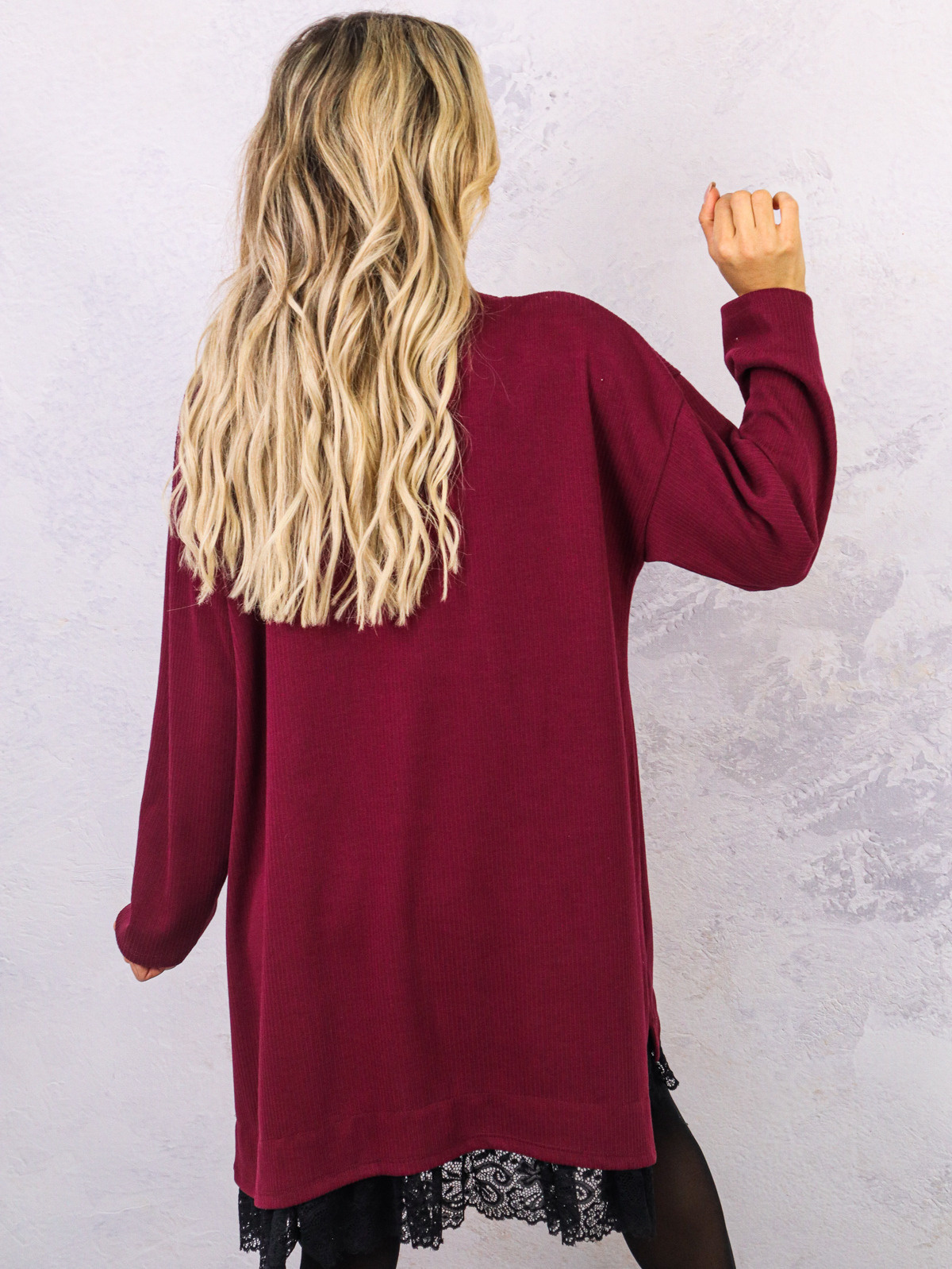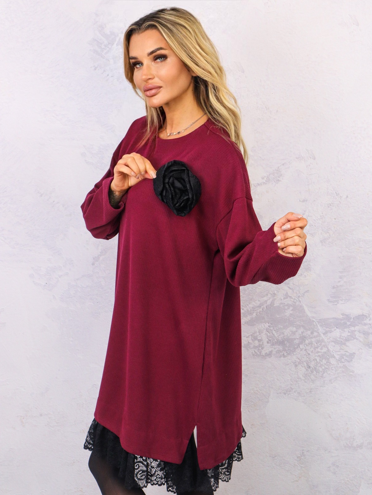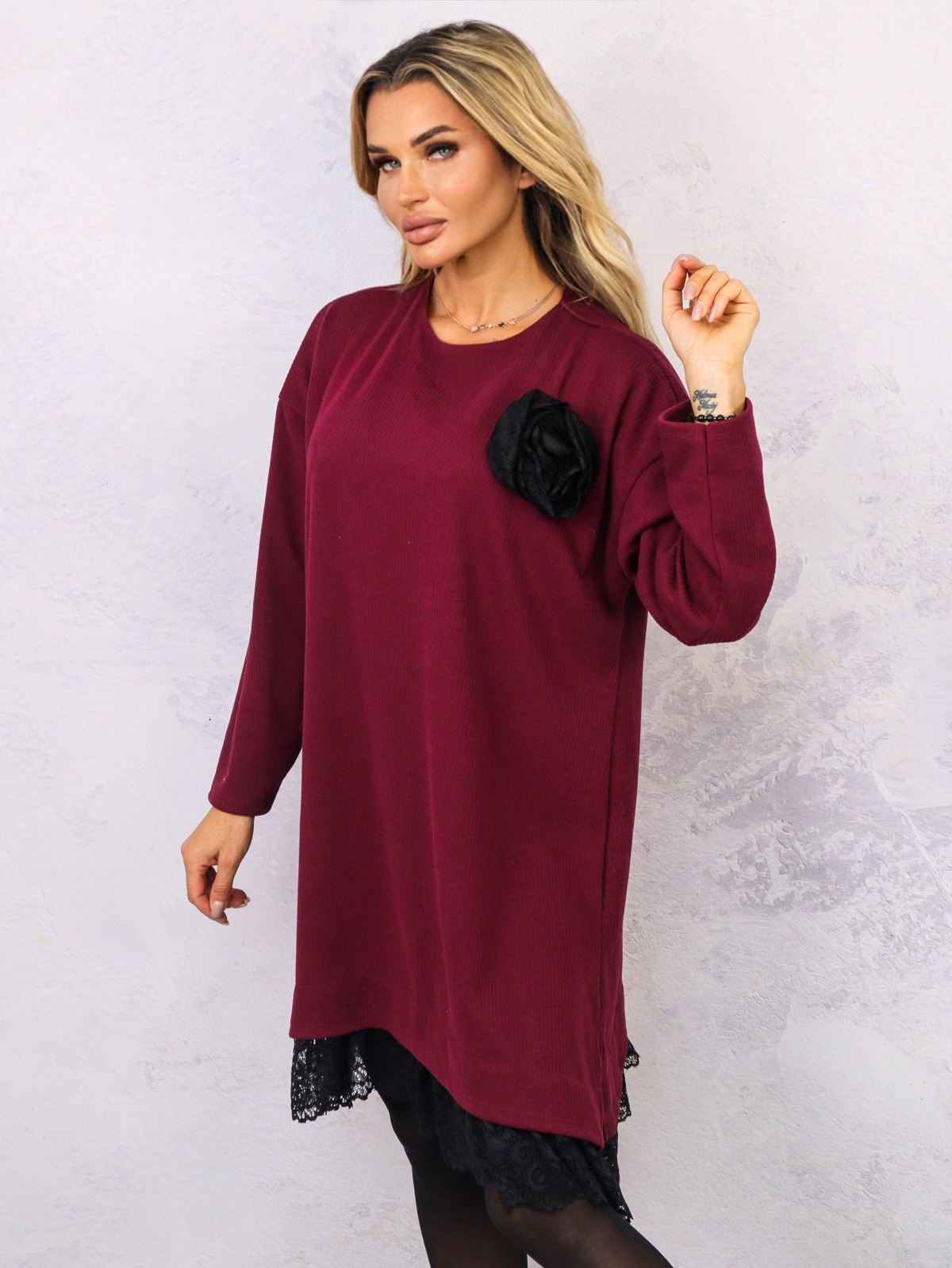 DZIANINOWA PRĄŻKOWANA SUKIENKA Z OZDOBNYM KWIATEM I KORONKĄ- BORDOWA