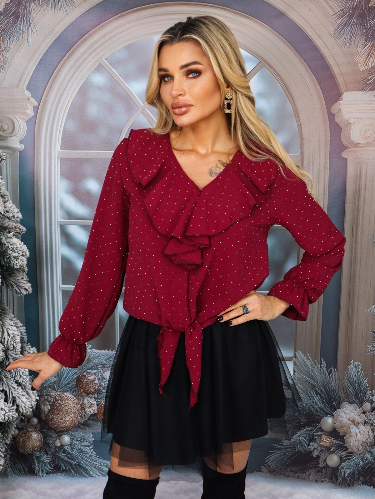 BLUZKA W CYRKONIE Z FALBANĄ PRZY DEKOLCIE- BORDOWA