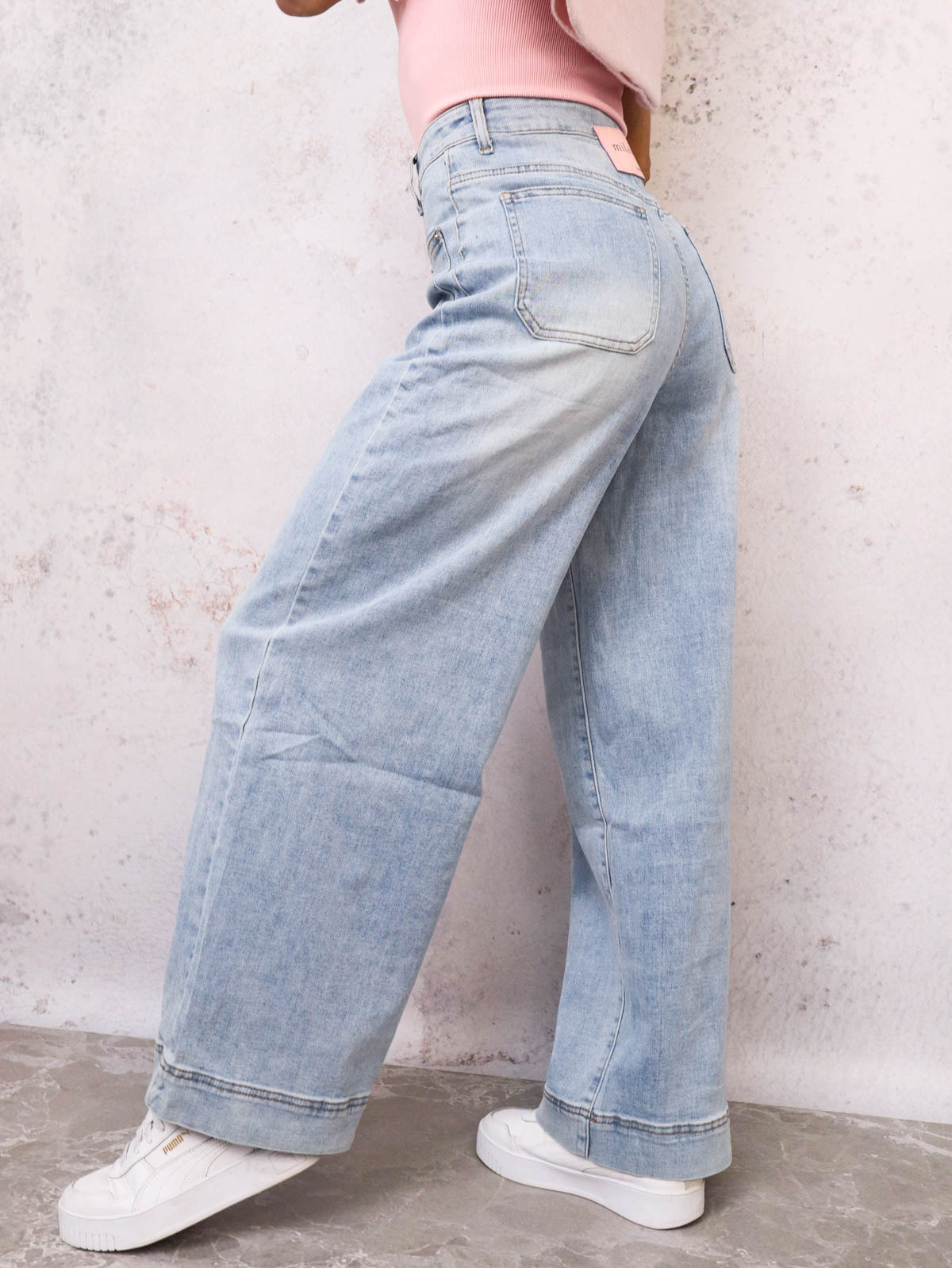 Spodnie jeansowe z szerokimi nogawkami. Ozdobne przeszycia i kieszenie na przodzie nogawek.